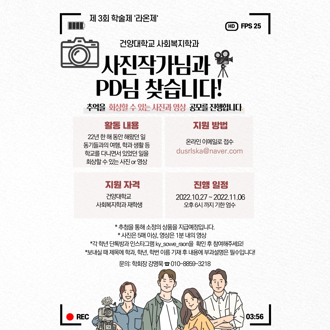 『 건양대학교 사회복지학과 사진작가님과 PD님을 찾습니다. 』글의 상세내용을 확인하는 표로 제목, 부서명, 등록일, 조회, 첨부, 내용으로 나뉘어 설명합니다.