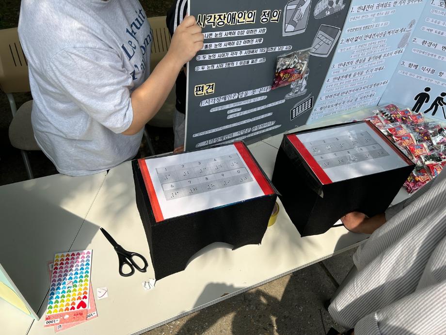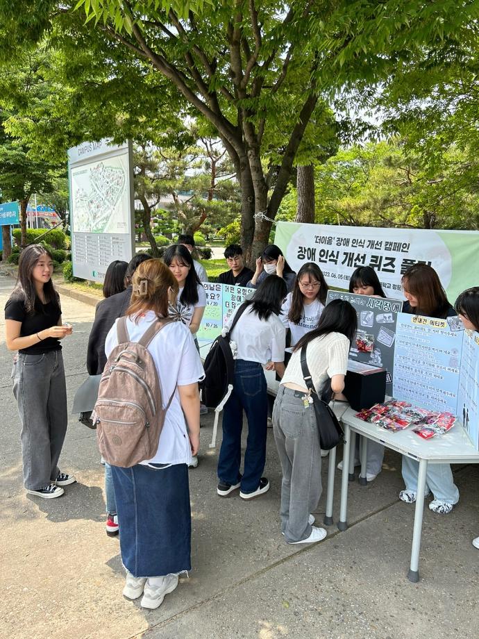 2023년 6월 5일 10시부터 13시까지 건양대학교 정문에서 사회복지학과의 동아리인 ‘맨도롱또똣’과 ‘논산시사람꽃복지관’이 함께하여 장애에 대한 인식을 개선하는 것을 계기로, ‘장애인식개선캠페인’을 주최하였습니다. ‘맨도롱또똣’ 동아리 임원들과 ‘논산시사람꽃복지관’은 장애인의 날, 장애의 유형, 점자 체험을 하는 등 장애에 대해 알아보는 퀴즈를 진행하였습니다. 건양대학교 정문에서 활동을 진행하여 건양대학교를 오고 가는 모든 학생들을 대상으로 장애인식개선캠페인을 진행함으로써 학생들의 적극적인 참여를 통해 장애에 대한 인식과 의견을 파악하는 모습을 보여주었습니다. |