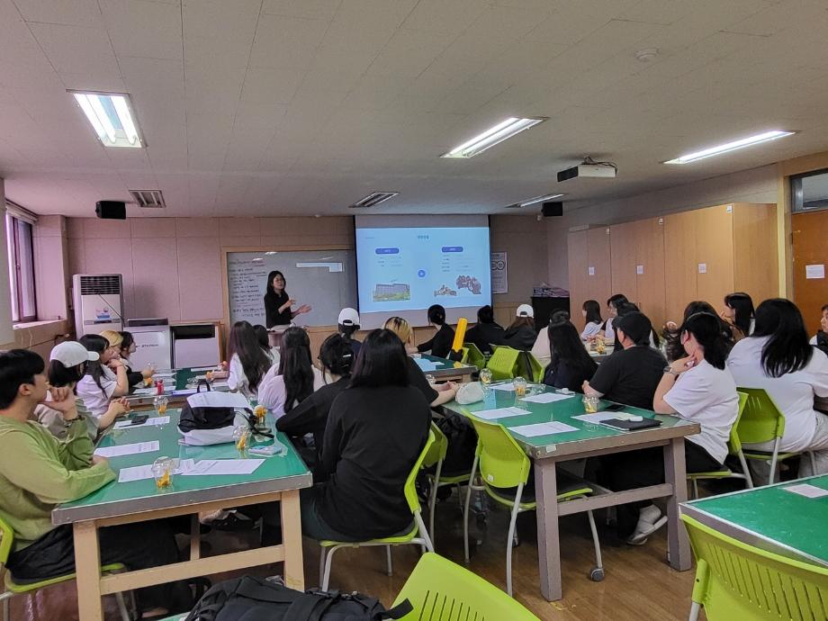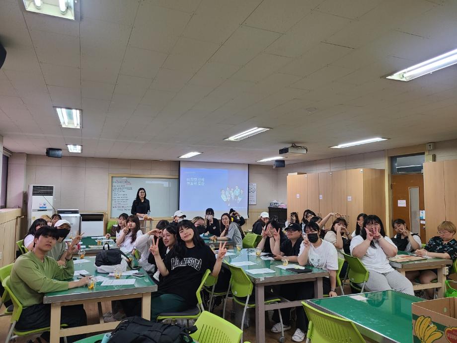 아동교육학과에서는 2023학년도 진로 및 취업 비교과 과정의 하나로 <취업준비형 모듈 프로그램>을 운영하였습니다. 5.25(목)에 경기노총 어린이집 원신 원장님(01학번 졸업생)이 1, 2학년 30명을 대상으로 졸업생 멘토로서 <대학생활 및 학교인프라 활용법, 이력서 작성 및 면접대처법, 어린이집에서의 직장생활과 질의응답 등>을 주제로 하는 취업전략특강을 진행하였습니다. 어린이집 교사를 거쳐 원장으로 재직하고 있는 선배 졸업생으로부터 어린이집 취업에 필요한 제반 지식을 습득할 수 있는 뜻깊은 시간이었습니다.