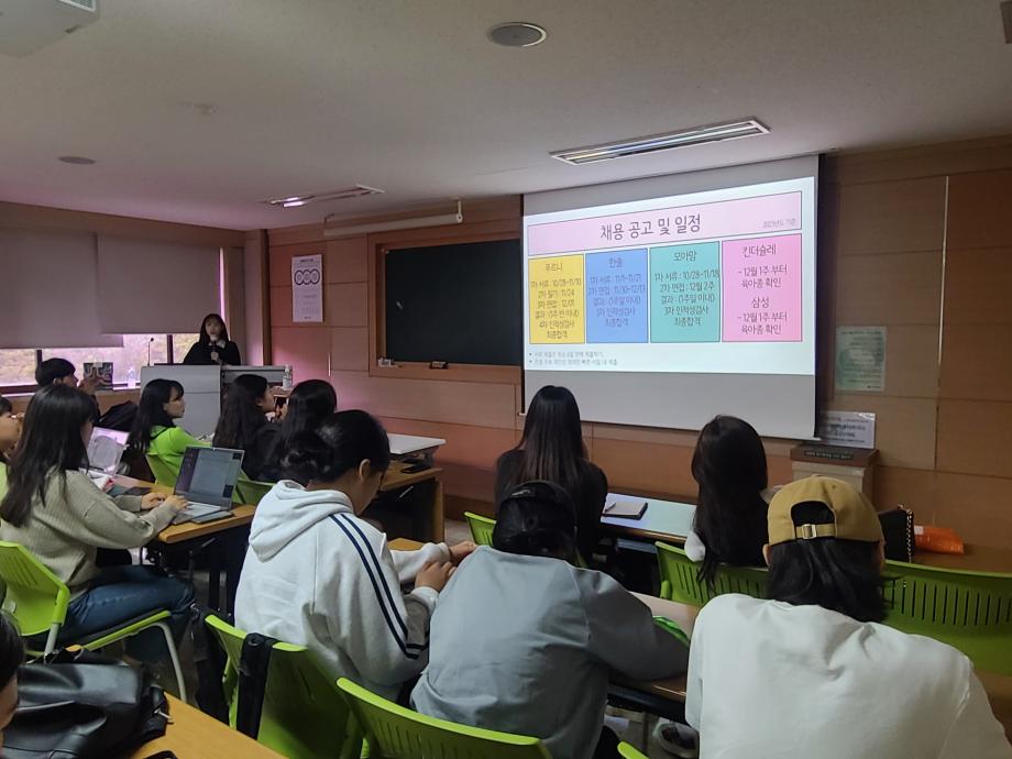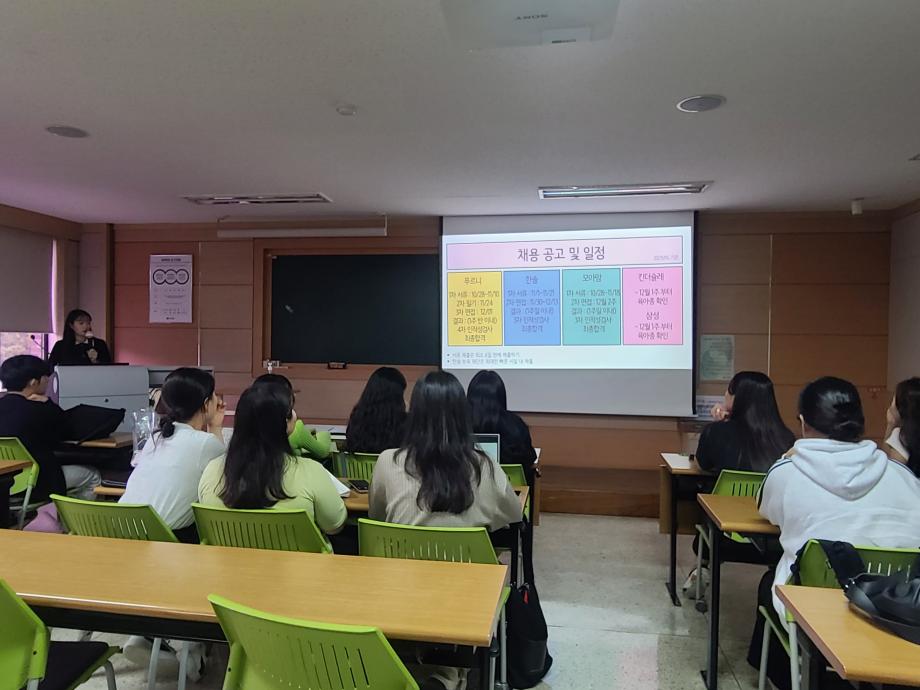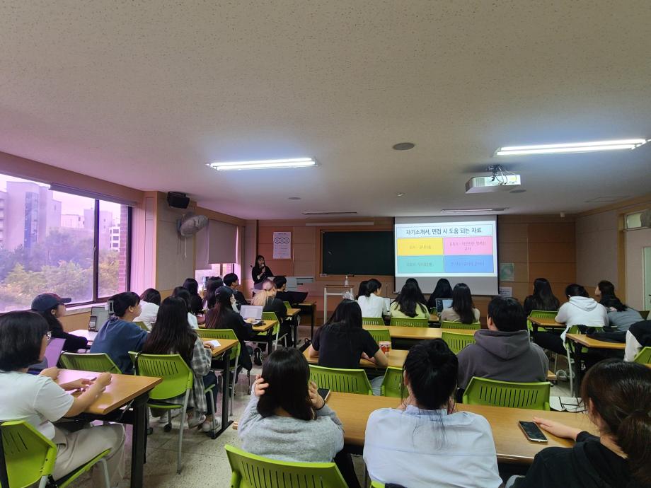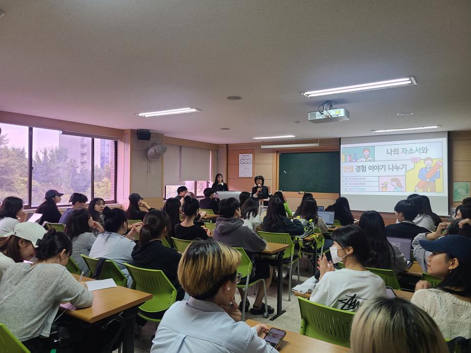 아동교육학과에서는 2023년 하반기 취업 비교과 프로그램의 하나로 <취업(입사지원서)특강>을 운영하였습니다. 9.21(목)에 한국항공우주연구원 KARI 하늘꿈 어린이집에서 근무하고 있는 김규미 교사(19학번 졸업생)가 <나의 자소서와 면접 경험 나누기>를 주제로 졸업과 취업을 앞둔 4학년 24명을 비롯한 전체 재학생을 대상으로 진행하여, 후배 재학생들에게 취업에 필요한 실전지식 및 취업을 준비하며 몸소 경험했던 소중한 경험을 공유한 바 있습니다. 아동교육학과에서는 졸업예정자의 취업 성공을 위하여 모의면접 및 자기소개서 작성법 등 실전교육 프로그램 운영을 계속할 예정입니다. |