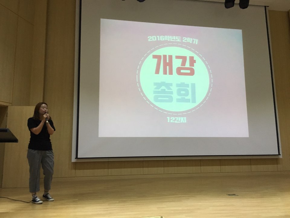 2016학년도 2학기 개강을 맞이 하여 개강총회가 진행되었습니다. 이번 개강총회에서는 학회장의 월별행사소개와 총무부장의 2학기 예산안 소개가 이루어졌습니다.