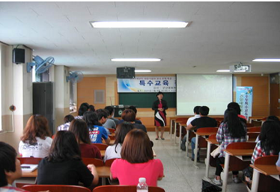지난 7월 8일, 군산명화학교의 성병숙 교장선생님께서 “특수교육전문가의 삶”이라는 주제로 특강을 위해서 우리 학교에 발걸음을 해 주셨다. 1~4학년 52명이 참여하여 인문관 302호에서 진행되었는데, 성병숙 교장선생님께서는 당신의 교육관, 가치관 등에 비추어 특수교육전문가로서의 삶은 어떠해야 하는지를 이해하기 쉽도록 전해주시고, 조언을 아끼지 않으셨다. 우리 학우들은 성병숙 교장선생님의 말씀을 유심히 새겨듣고, 특수교육전문가로서의 삶에 대해 한 번 더 고민해보고 한 발자국 더 가까워 질 수 있는 아주 값진 시간이었다.