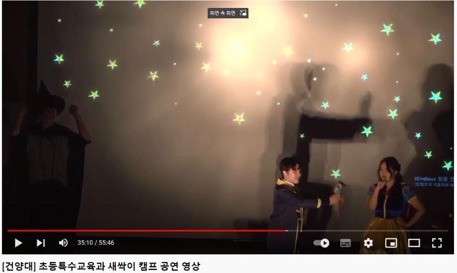 2022년 18회를 맞는 건양 새싹이 캠프의 공연 영상입니다. 건양 새싹이 캠프는 2005년 문화체육관광부와 대전광역시의 지원을 받아 시작한 장애 학생과 비장애 학생을 위한 통합캠프입니다. 매년 30-100명의 장애 학생과 비장애 학생에 참가하여 그동안 1,000명이 넘는 학생들이 참가하였습니다. 학과 내 동아리인 도토리를 비롯하여 다양한 특기동아리들이 힘을 모아 환영 공연을 준비하고, 매년 새로운 주제로 2박 3일 동안 신나는 이야기의 나라로 초대하는 새싹이 캠프는 이제 건양 초특의 첫번째 자랑거리가 되었습니다.
