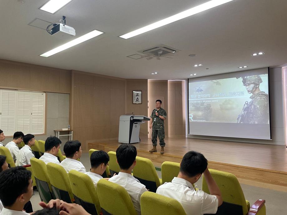 2024학년도 군사학과 특강 - 주제 : 초급간부 처우와 장기복무, 병과분류 등 - 일자 : 2024.05.30(목) - 장소 : 산학협력관 515호(충무홀) - 강사 : 서태원 중령 (육군본부 인사사령부 학군협약장교) |