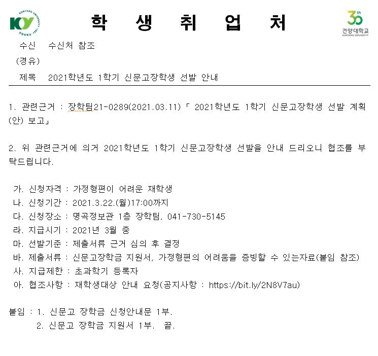 | 제목 | 2021학년도 1학기 신문고장학생 선발 안내 | ||||