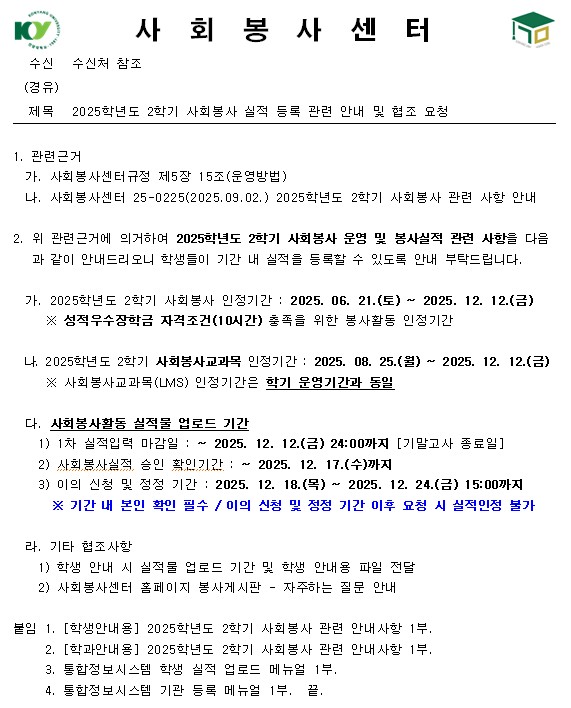 | 제목 | 2025학년도 2학기 사회봉사 실적 등록 관련 안내 | ||||