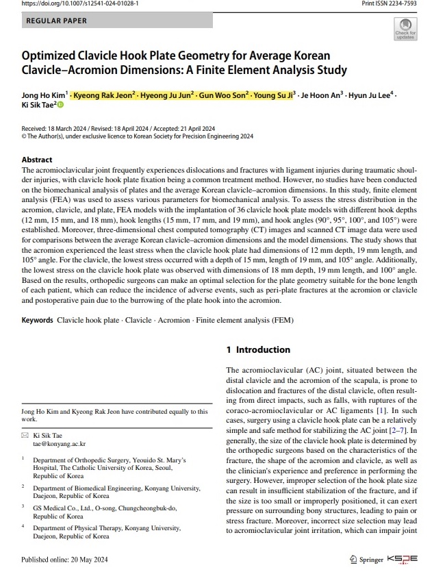 19학번 전경락, 손건우, 18학번 지영수, 전형주 학생 (생체역학및재활공학랩, 지도교수: 태기식)이 "Optimized Clavicle Hook Plate Geometry for Average Korean Clavicle–Acromion Dimensions: A Finite Element Analysis Study" 주제로 국제학술지논문(SCI)에 등재되었습니다. 본 주제는 한국인에게 최적화된 쇄골 골절용 hook plate의 형상을 찾는 연구로 기존 한국인에 최적화된 임플란트 형상 연구가 없어 차후 수술 시 기초자료로 활용할 수 있는 의미있는 연구로 평가되었습니다. 여의도성모병원 및 기업과 공동 연구한 결과로 전경락학생이 공동 제1저자, 나머지 학생은 공동저자로 참여하였습니다. 학부생으로서 SCI 국제 저널에도 좋은 성과가 앞으로도 계속 있길 바랍니다. 축하합니다. |