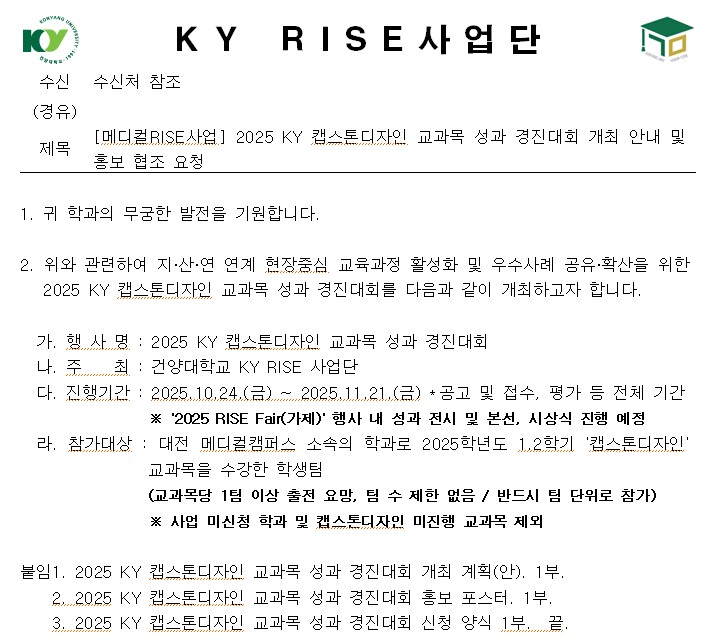 | 제목 | [공지][메디컬RISE사업] 2025 KY 캡스톤디자인 교과목 성과 경진대회 개최 안내 | ||||