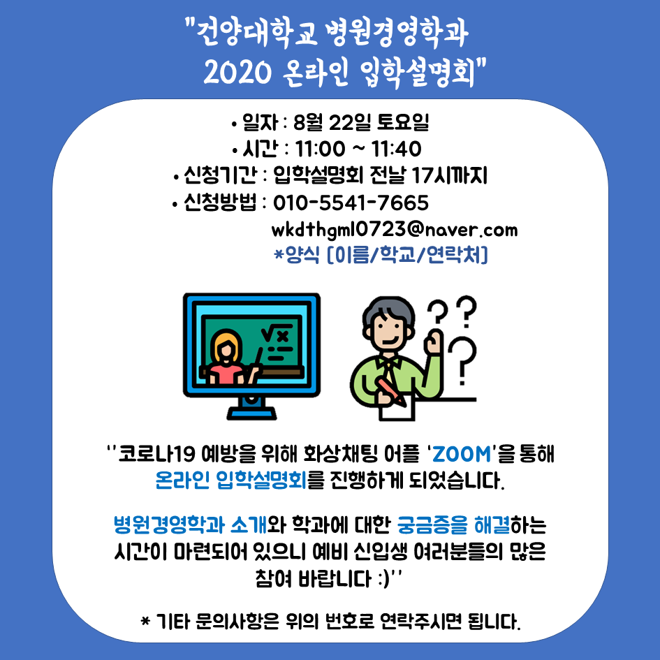 "코로나 예방을 위해 화상채팅 어플 ‘ZOOM’을 통해 온라인 입학설명회를 진행하게 되었습니다." 병원경영학과에 대한 소개와 학과에 대한 궁금증을 해결하는 시간이 마련되어 있습니다. 예비 신입생 여러분의 많은 관심과 참여 부탁드립니다☺