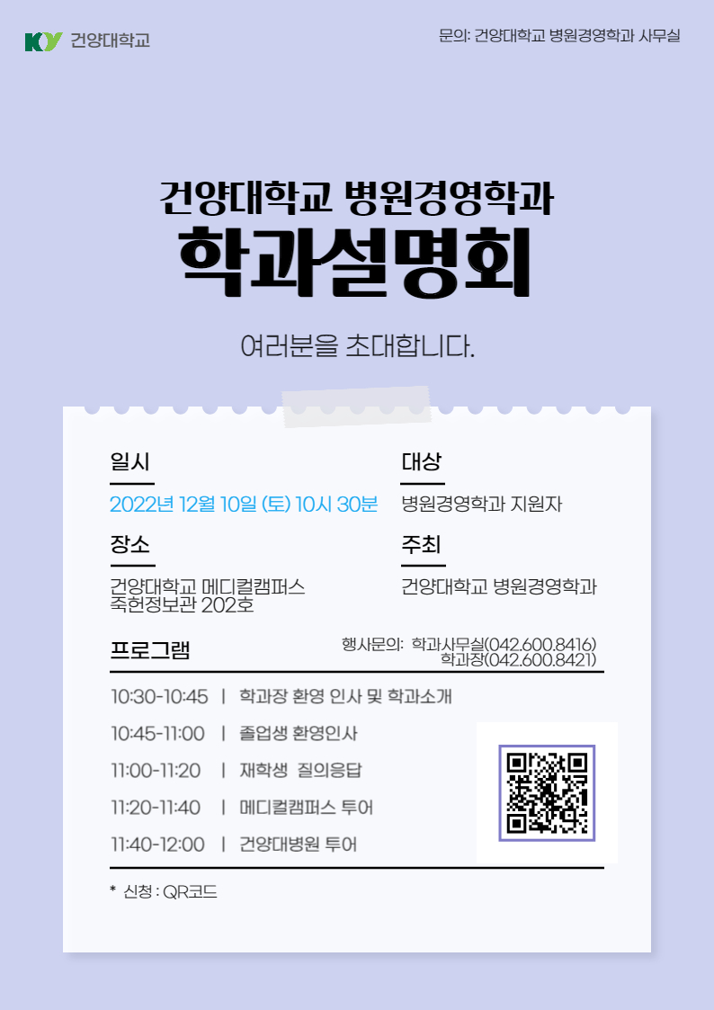 『 2022학년도 병원경영학과 학과설명회 개최 』글의 상세내용을 확인하는 표로 제목, 부서명, 등록일, 조회, 첨부, 내용으로 나뉘어 설명합니다.