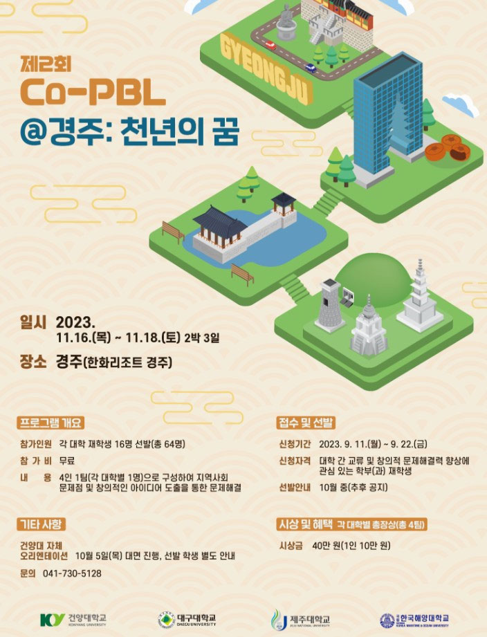 『 "제2회 Co-PBL@경주 : 천년의 꿈" 프로그램 안내 』글의 상세내용을 확인하는 표로 제목, 부서명, 등록일, 조회, 첨부, 내용으로 나뉘어 설명합니다.