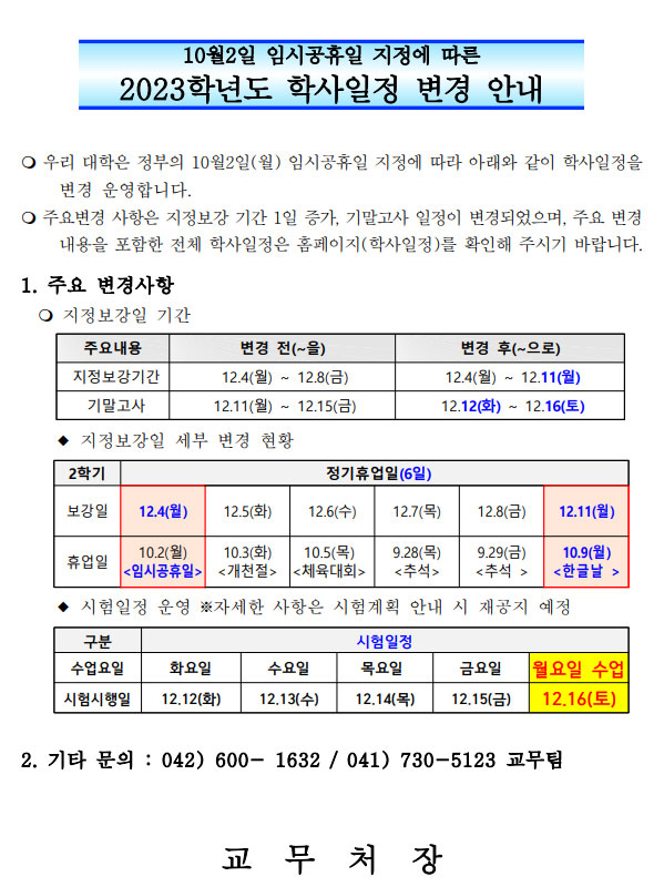 『 10월 2일 임시공휴일 지정에 따른 학사일정 변경안내 』글의 상세내용을 확인하는 표로 제목, 부서명, 등록일, 조회, 첨부, 내용으로 나뉘어 설명합니다.