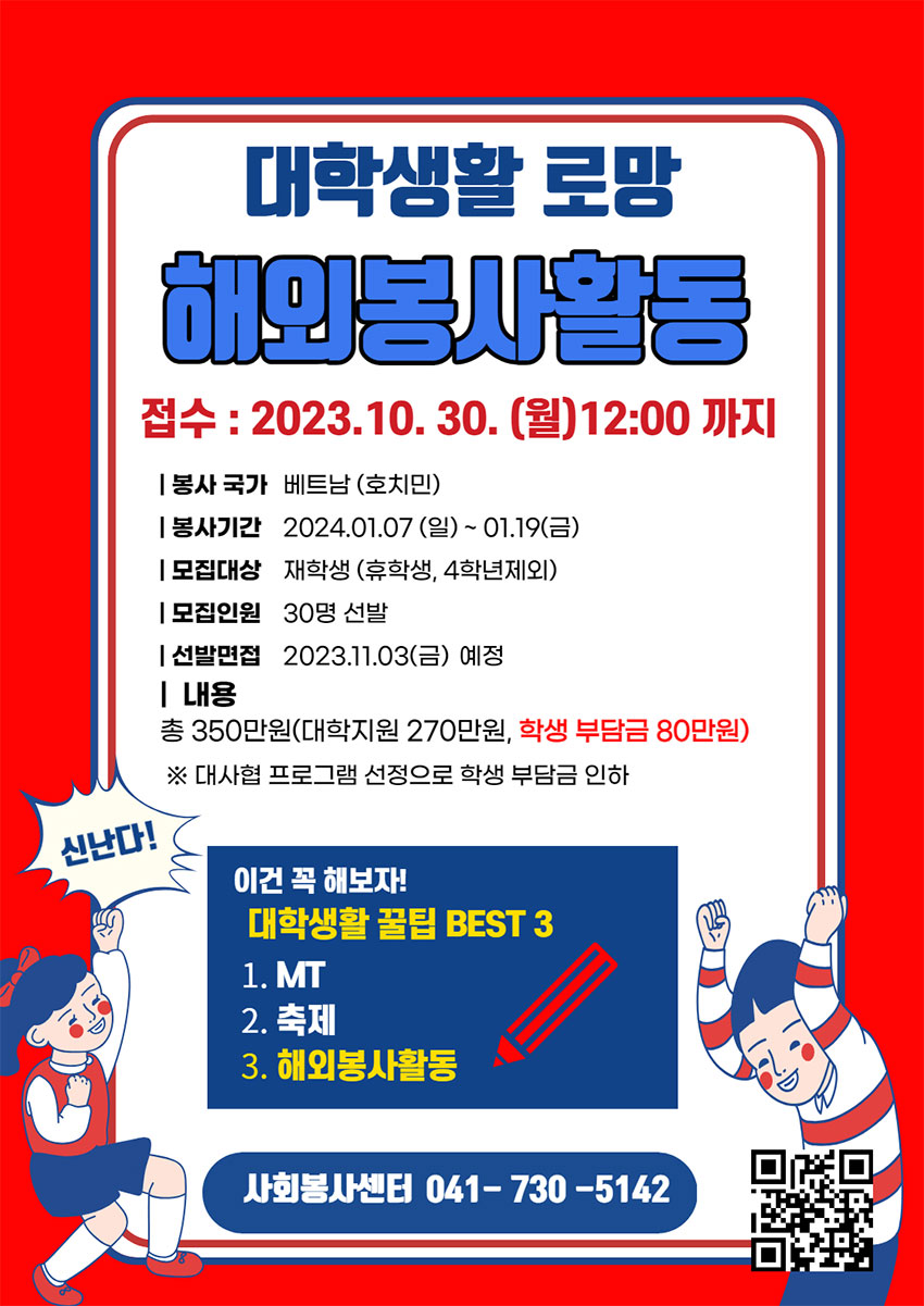 | 제목 | 2023년 14기 베트남 해외봉사 단원 모집기간 연장 | ||||
