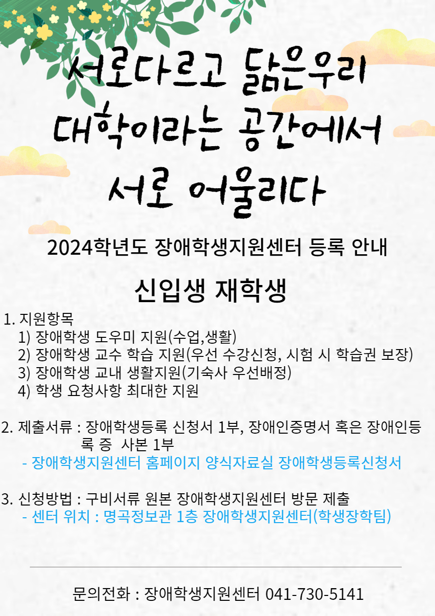 『 2024학년도 장애학생지원센터 신규 장애학생 모집 안내 』글의 상세내용을 확인하는 표로 제목, 부서명, 등록일, 조회, 첨부, 내용으로 나뉘어 설명합니다.