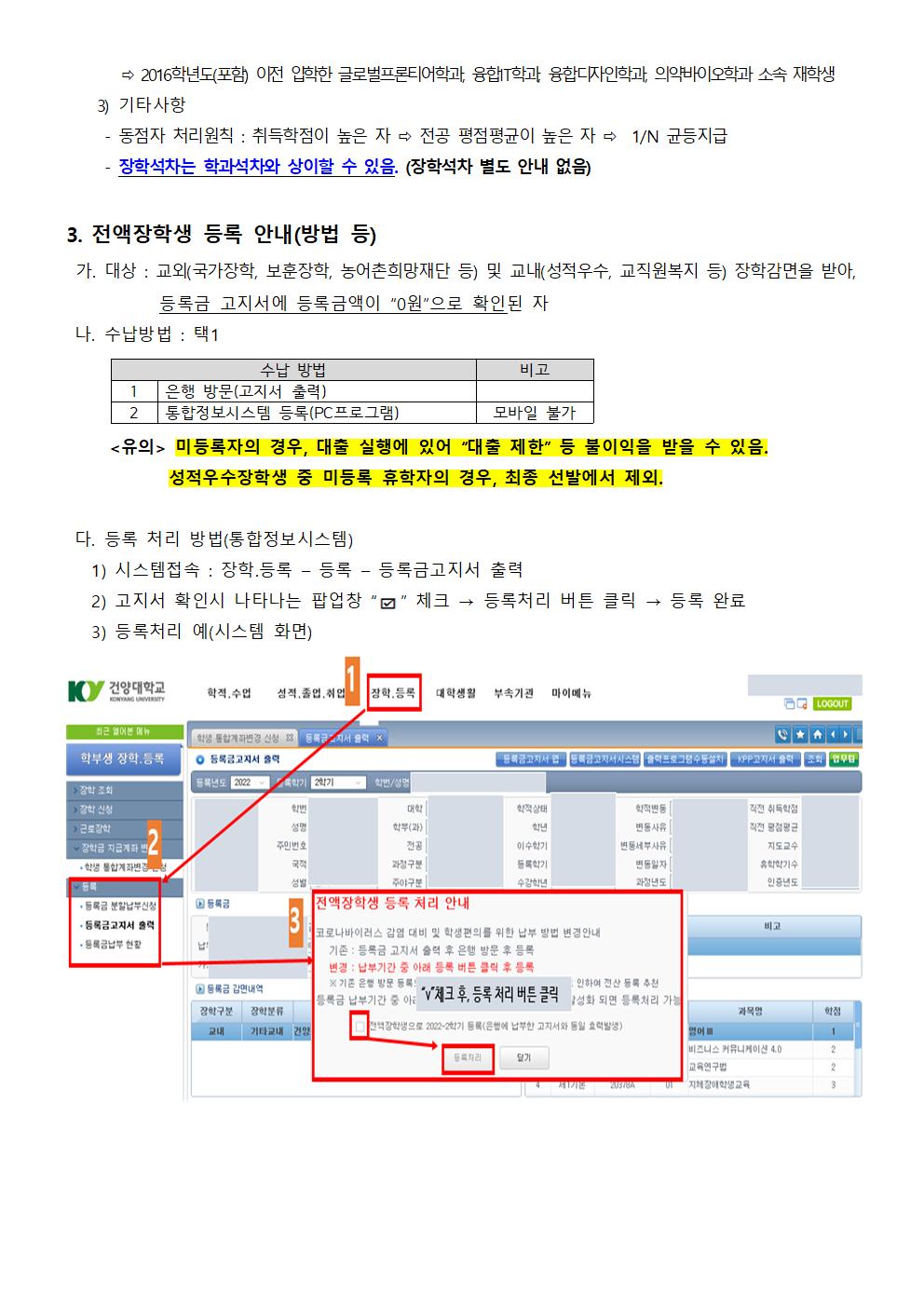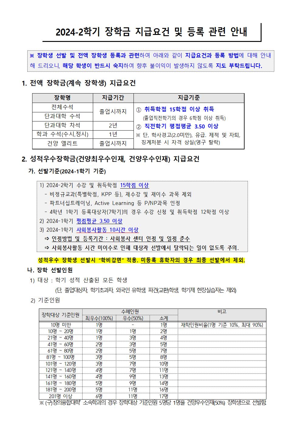 『 2024-2학기 장학금 지급요건 및 등록 관련 안내 』글의 상세내용을 확인하는 표로 제목, 부서명, 등록일, 조회, 첨부, 내용으로 나뉘어 설명합니다.