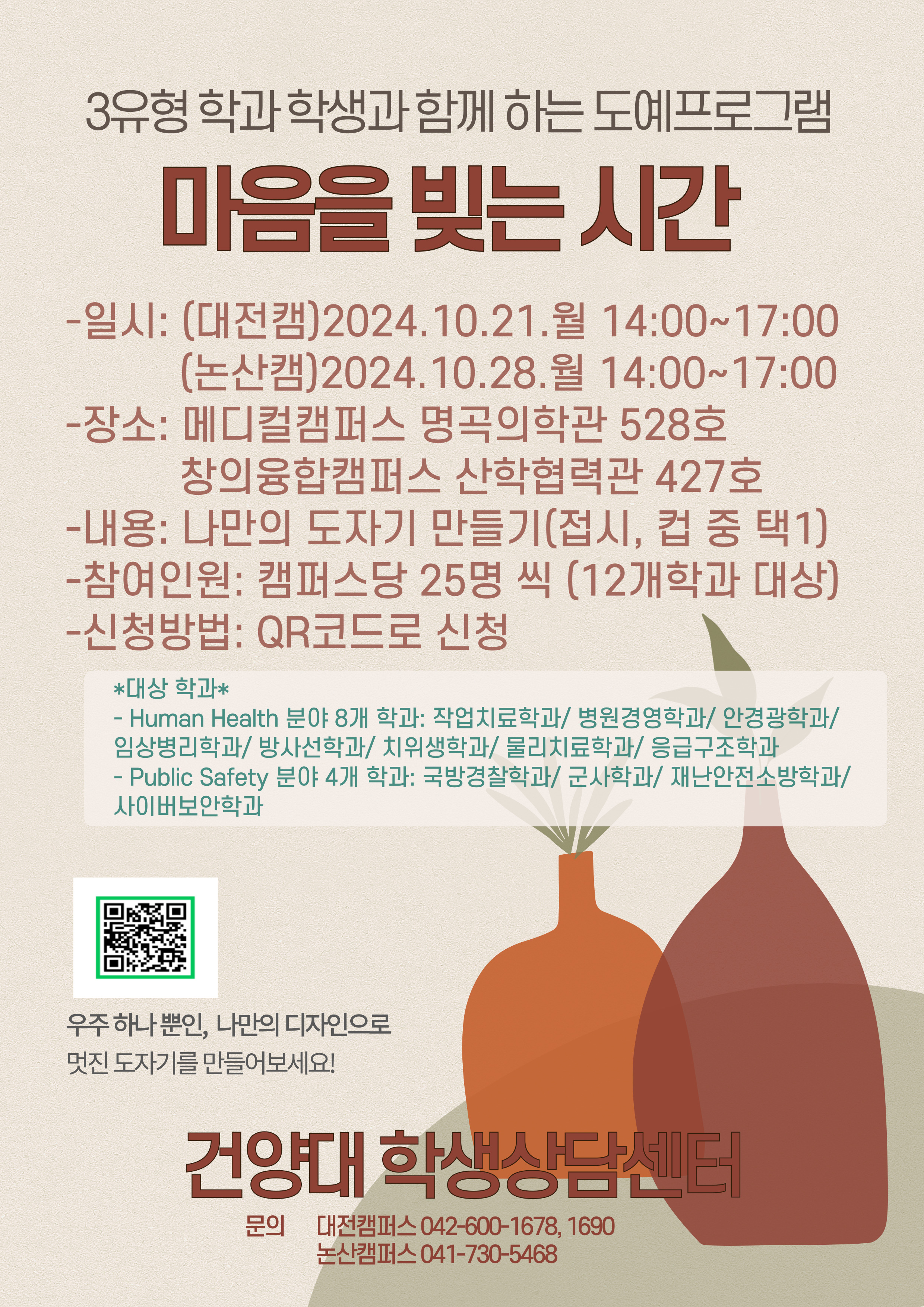 『 마음을 빚는 도예 힐링 프로그램 안내 』글의 상세내용을 확인하는 표로 제목, 부서명, 등록일, 조회, 첨부, 내용으로 나뉘어 설명합니다.