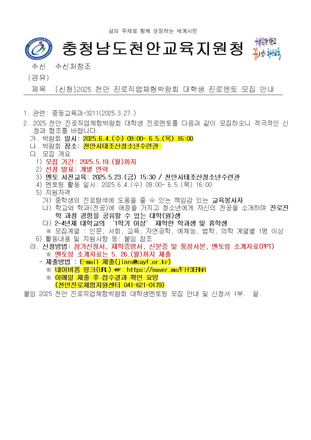 | 제목 | [신청]2025 천안 진로직업체험박람회 대학생 진로멘토 모집 안내 | ||||