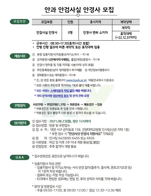 건양대학교 안과 안검사실에서 안경사를 채용합니다.