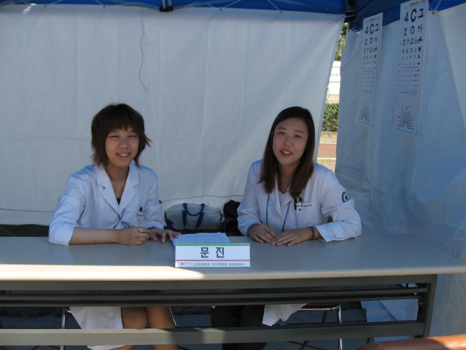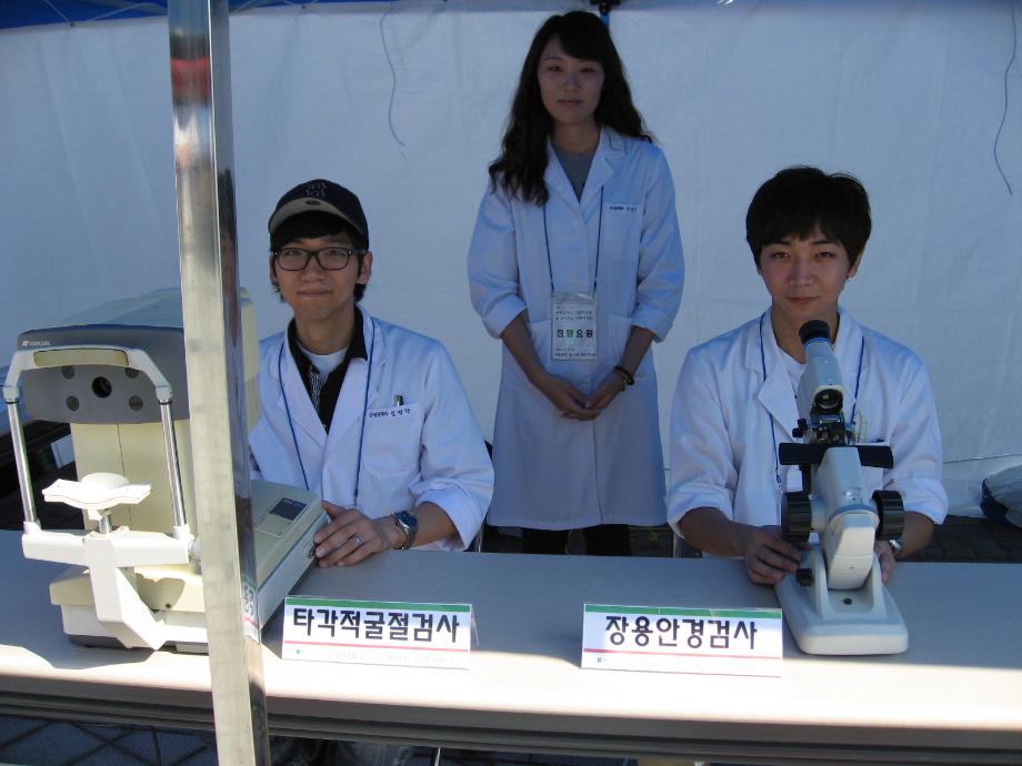 2011.09.24(토), `2011 여성장애인 취업박람회 검안봉사 & 찾아가는 이동복지관` 행사에 서 3학년 및 2학년 학생 13명이 검안봉사에 참여하였습니다. 문진, 장용안경검사, 타각적 굴절검사, 자각적굴절검사, 입체시검사, 암슬러검사, 색각검사 등을 실시하였고 참가자들 로부터 좋은 호응을 얻었습니다.
