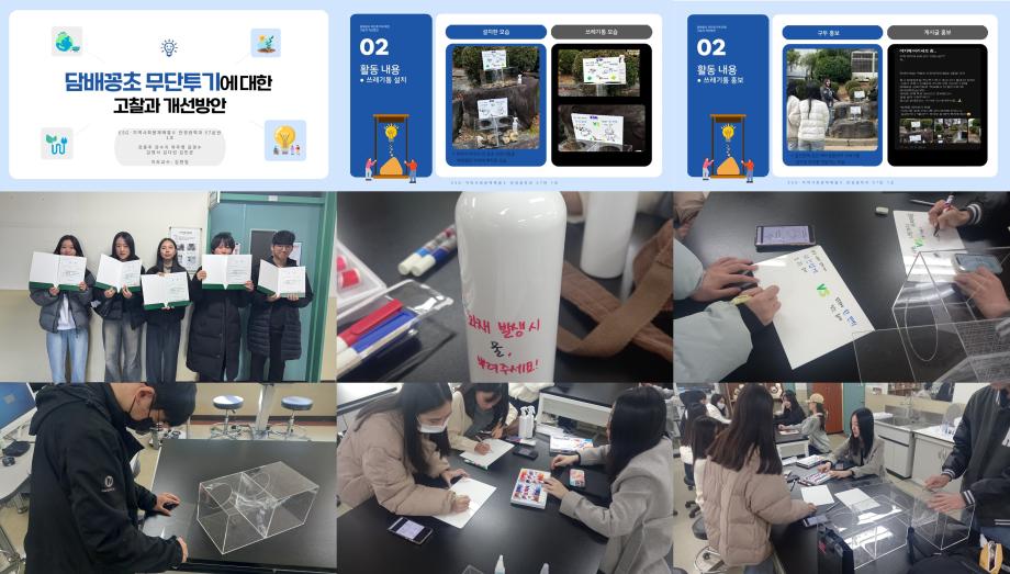 작년 2학기 ESG·지역사회 문제해결 우수사례 공모전에서 안경광학과(57분반 1조) 학생들이 "담배꽁초 무단투기에 대한 고찰과 개선방안"으로 장려상을 수상하였습니다. 교내 담배꽁초 무단투기를 줄이고 환경보호와 깨끗한 교내 미관 조성에 기여해볼 수 있는 좋은 기회이었습니다. 참여한 재학생들과 지도교수님 모두 수고 많으셨습니다.
