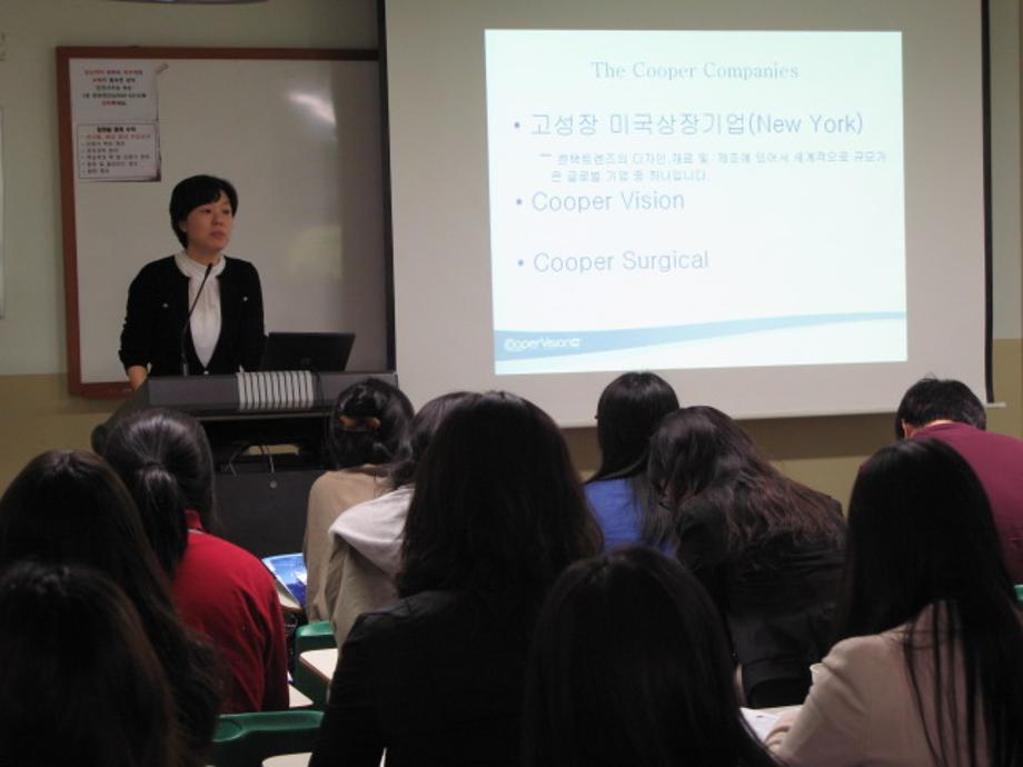 건양대, 쿠퍼비젼 C/L 세미나 열어 건양대학교 안경광학과(학과장 김재민 교수)는 월요 콘택트렌즈 세미나 일환으로 (주)쿠 퍼비젼코리아의 신제품 상품지식 및 신소재 소개 교육을 2주에 걸쳐 가졌다. 지난 4월 27일과 5월 18일, 두 차례 진행된 이번 세미나에서 쿠퍼비젼코리아의 손금수 부 장은 3시간 동안 상품지식과 제3세대 실리콘하이드로겔 렌즈인 바이오피니티의 특성에 대 해 소개 했다. 또 쿠퍼비젼코리아는 콘택트렌즈 재질 특성에 대한 자세한 설명과 함께 졸업 후 콘택트렌 즈를 판매하지 말고 처방할 것을 강조했다. 건양대학교 안경광학과는 매학기 다양한 세미나로 산업체 관계자와 안경사를 초빙해 교육 을 진행하고 있다. 이 같은 세미나를 통해 졸업 후 진로인 취업 및 안경사 국가고시의 성 적에도 좋은 결과를 낳고 있다는 것이 건양대 측의 설명이다. 건양대학교 안경광학과는 토릭렌즈 피팅, 노안을 위한 모노비젼 피팅, 피기백 렌즈 피 팅, 구면과 비구면 RGP렌즈 피팅, 실리콘하이드로겔렌즈 피팅, 소프트렌즈 피팅 등 콘택 트렌즈에 대해 4학기 동안 다양한 실습과 이론을 병행, 진행하고 있다 |