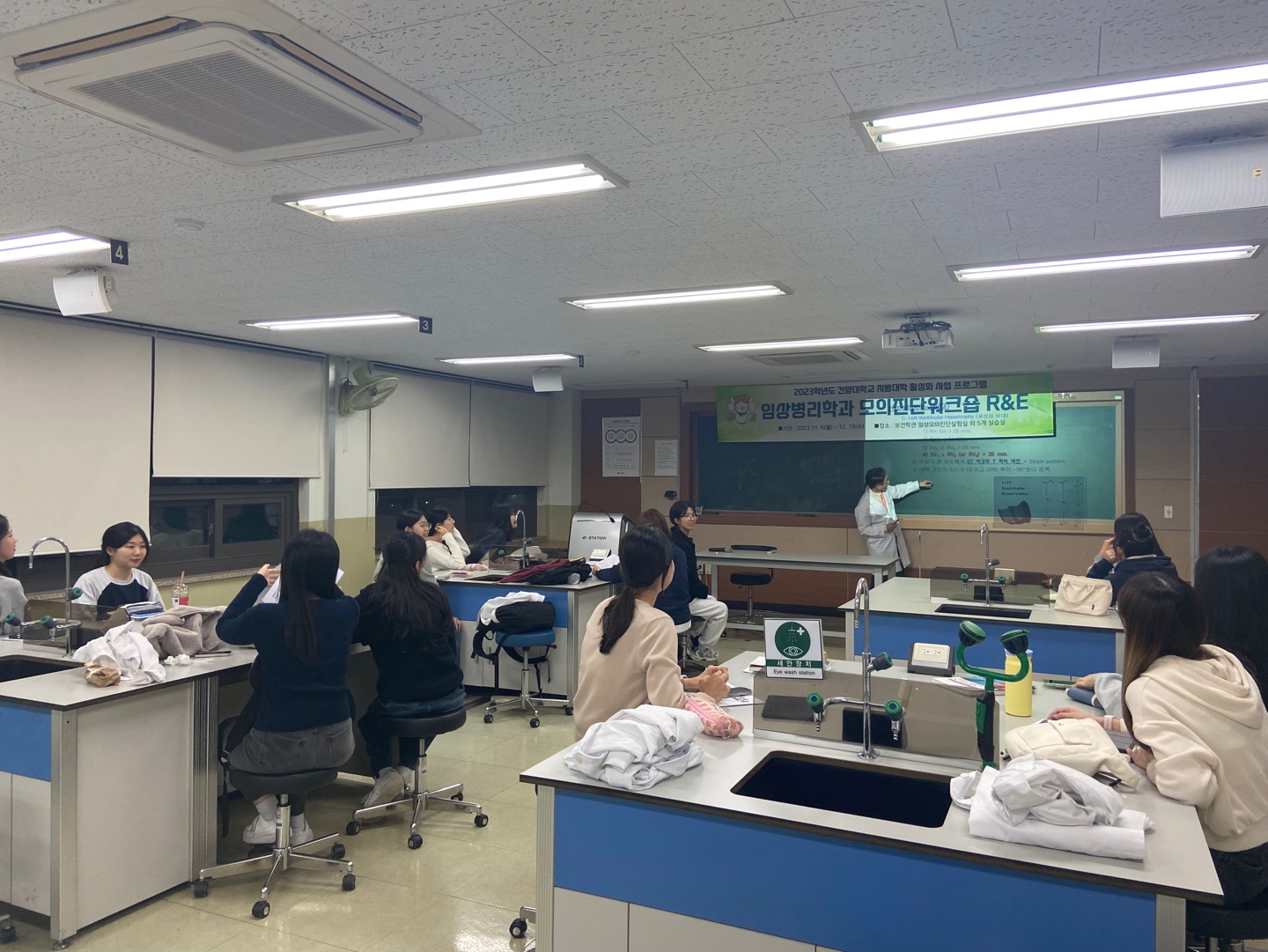 이번 2023학년도 임상병리학과 모의진단 워크숍 R&E 프로그램 운영함에 따라 관련사항 알려드립니다. 가. 시행목적: 전문임상병리사 양성을 위한 분야별 워크숍을 통한 전공이해도 향상 나. 운영기간: 2023. 11. 6(월) ~ 11. 15(수) 다. 참여대상: 임상병리학과 1~4학년 라. 참여인원: 총 90명(교원: 6명, 진행요원: 11명, 재학생: 73명) 마. 운영장소: 건양대학교 보건학관 임상병리학과 6개 실습실 바. 운영내용: 1)심전도의 기록과 판독 2)세포배양 기초 기술과 현미경 사용법 3)실험동물을 활용한 실험기법 4)단백질 발현 분석을 위한 기초 실험 기법 5)인유두종 바이러스 감염의 조직, 세포 진단방법 6)Flow cytometry를 활용한 다양한 세포분석
