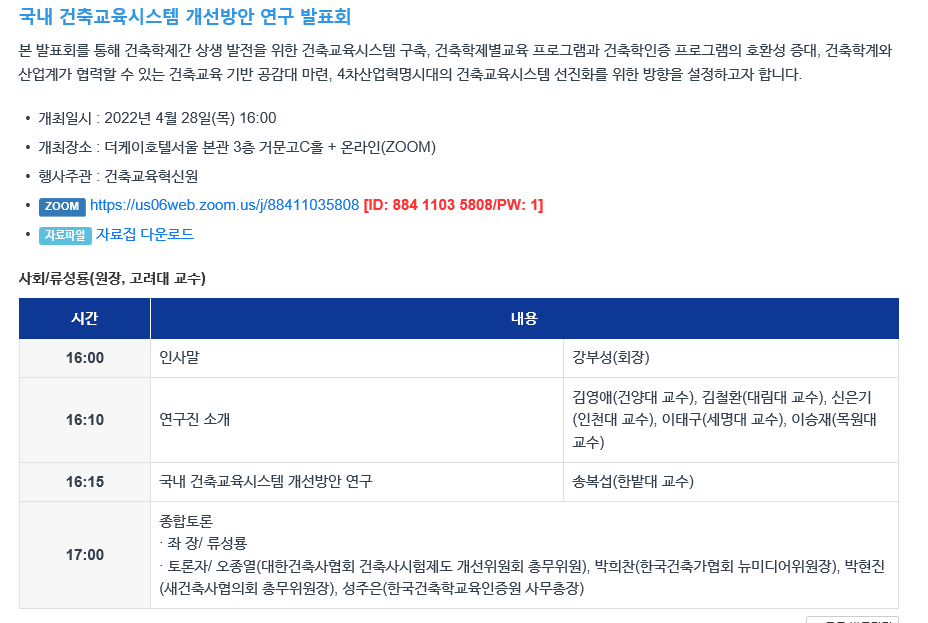 2022년 4월 28일 대한건축학회 춘계학술발표대회에서 국내 건축교육시스템 개선방안 연구 발표회가 있었습니다. 이를 통해 건축학회에서 진행해온 4년제 건축관련학과 졸업생들도 건축설계사무소 취업자들의 건축사시험 응시가 가능해졌습니다. 개인설계이력제와 특별교육과정 등이 보완될 계획입니다. 간략하게 내용을 정리해 알립니다.