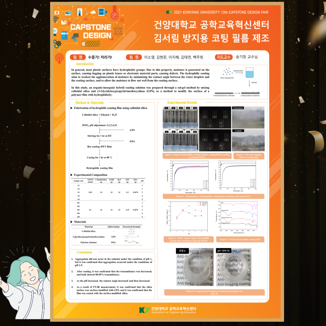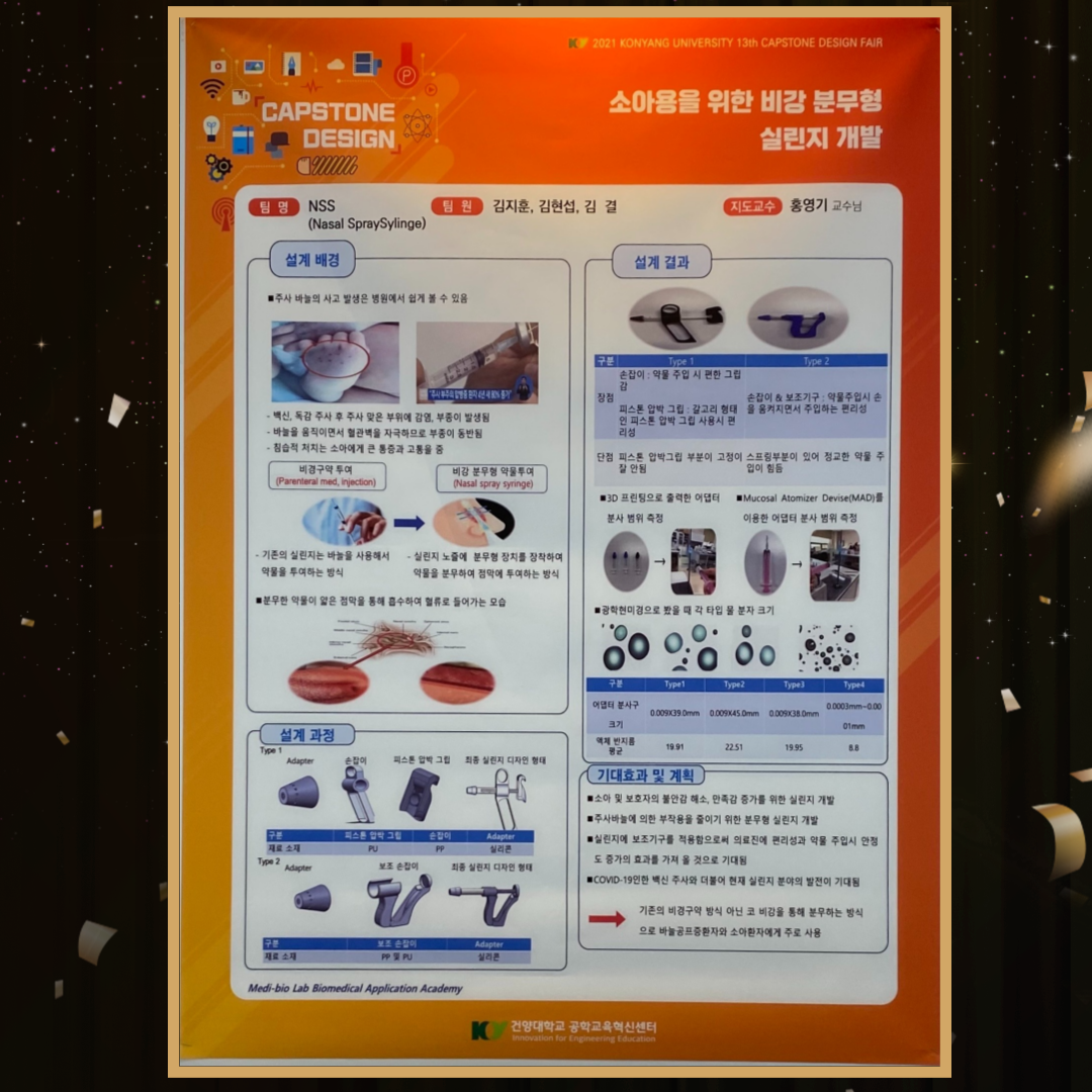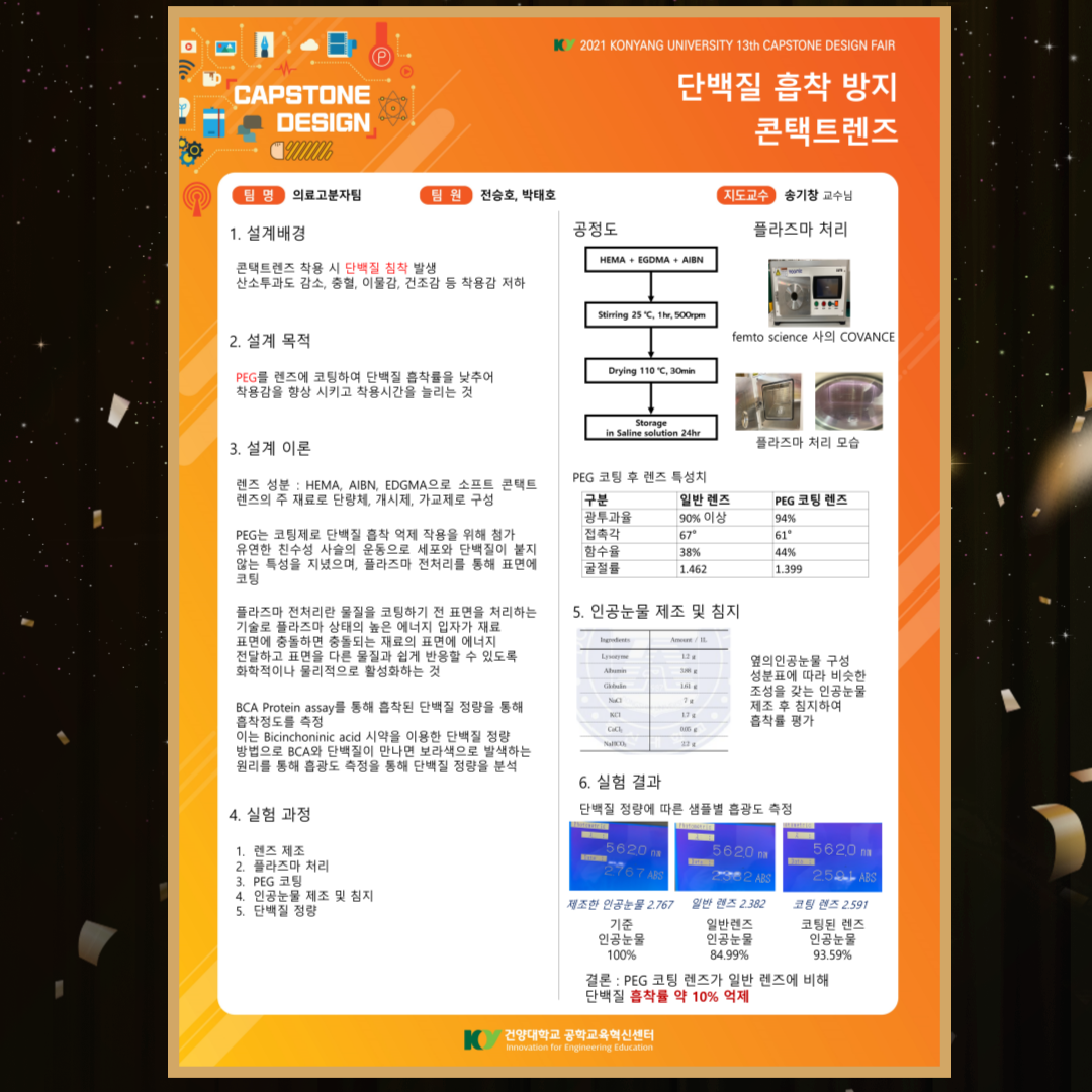 지난 9월 27~28일 건양대학교 공학교육혁신센터에서 주최한 '2021 캡스톤 디자인 경진대회'에서 의료신소재학과 재학생들이 우수한 성적을 거뒀습니다. 많은 축하 부탁드립니다. |