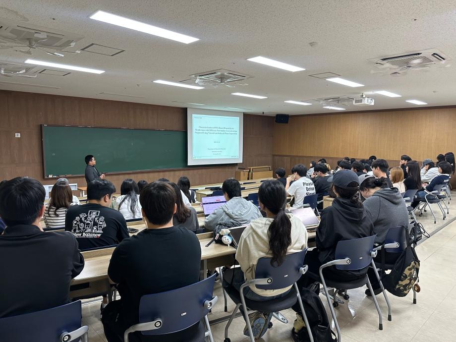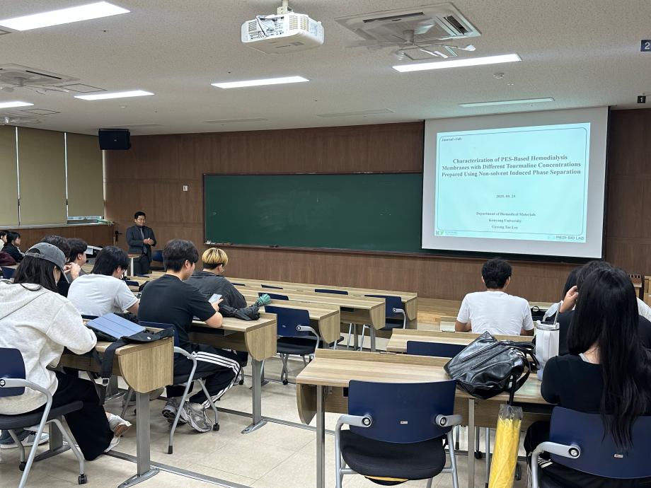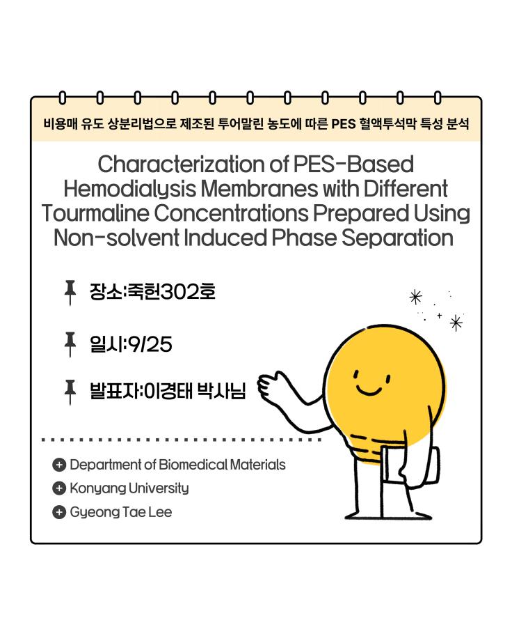 1. 장소 : 메디컬캠퍼스 죽헌정보관 302호 2. 일시 : 2025.09.25(목) 4. 주제 : 비용매 유도 상분리법으로 제조된 투어말린 농도에 따른 PES 혈액투석막 특성 분석 |