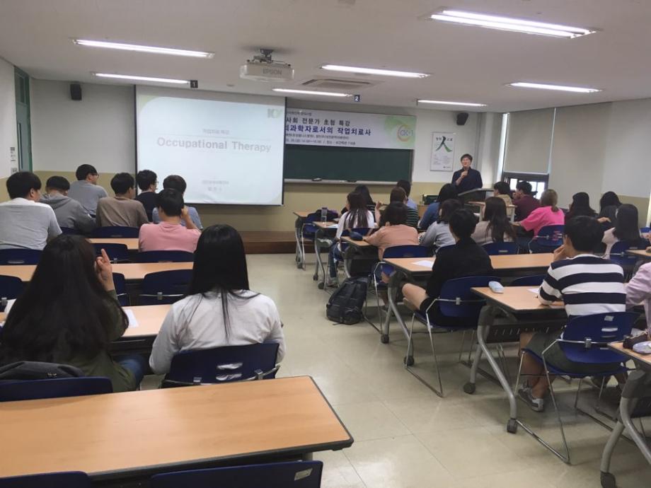 STEM 교육을 통한 의과학 연구지원인력 양성사업의 일환으로 진행한 지역사회 전문가 특강이 2017년 5월 26일에 작업치료학과 1학년 학생을 대상으로 유성웰니스병원 송예원 선생님과 대전광역치매센터 함민주 선생님을 모시고 임상가와 의과학자로서의 작업치료사라는 주제로 진행되었습니다. 오늘 강의는 보건의료전문가 역량을 가진 의과학자의 역할과 미래 비전에 대해 경험하고 임상가와 의과학자로서 작업치료 현장의 모습을 들을 수 있는 좋은 시간이었습니다. 특히, 건양대학교 작업치료학과 졸업생 선배님들의 강의를 통해 현실적이고 유익한 시간이었습니다.