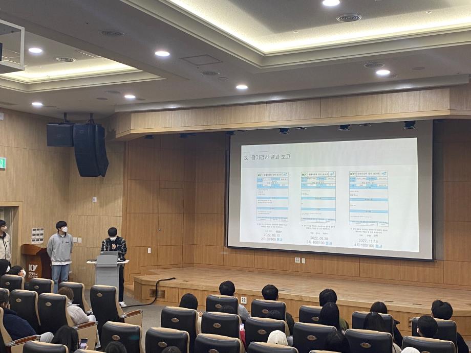 2022.12.16에 2022학년도 2학기가 모두 끝이 났습니다❗ 기말고사 기간을 피해서 미리 종강총회를 진행하여 지난 선거를 통해 선출된 18대 학생회 학회장, 부학회장 외에도 각 국의 국장, 차장들을 소개하는 시간을 가졌습니다. 또한, 정기감사 결과 보고를 통해서 이번 학기에 학생회비가 사용된 곳에 대해서도 학우 여러분들에게 알려드렸습니다. 끝으로 학우 여러분들의 2022학년도 2학기가 즐겁고 유익한 시간이 되었기를 바라겠습니다~ |