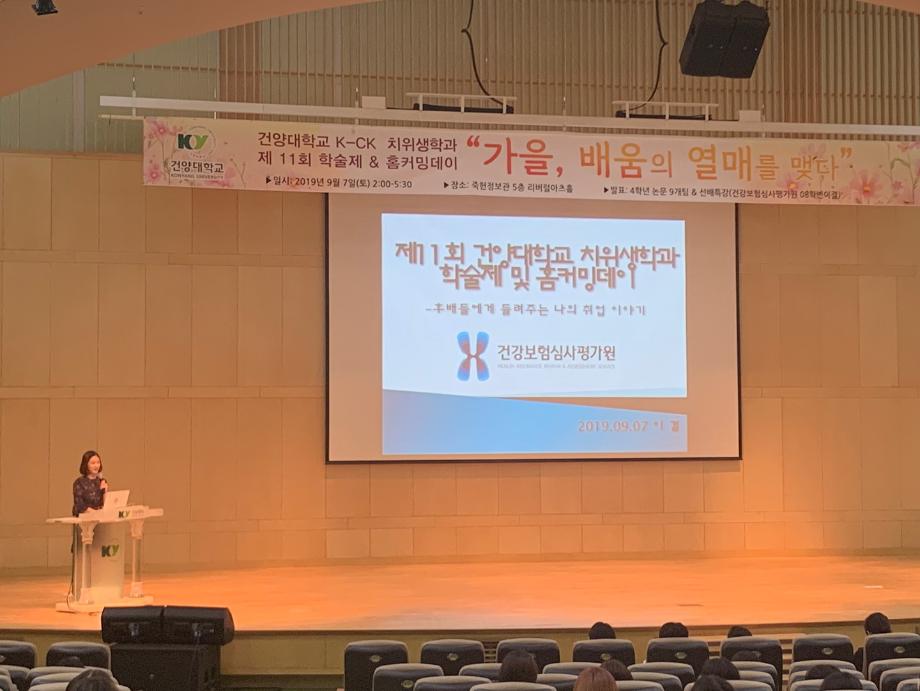 건양대학교 치위생학과(학과장 김설희)는 9월 7일 건양대학교 리버럴아츠홀에서 제11회 학술제 및 홈커밍데이를 개최했다. ‘가을, 배움의 열매를 맺다’를 부제로 내건 이번 학술제 및 홈커밍데이는 건양대 의과학대학 유영빈 학장, 대전충남치과위생사회 송은주 회장, 대전광역시 치과의사회 한창규 부회장 등이 참석한 가운데 송은주 회장의 ‘치과위생사의 길을 Do-Dream: 나는 치과위생사’ 주제의 특강, 4학년 9개 연구팀의 논문발표, 건강보험심사평가원에 재직 중인 08학번 이결 졸업생의 선배특강 순으로 진행됐다. 이날 발표된 논문은 *치과재료의 최근 임상동향 *치과용 산 부식제 적용시간 및 농도에 따른 구강상피세포의 영향 *피톤치드를 함유한 복합레진의 물리적 및 항균 특성 *양칫물 온도에 따른 구취의 영향 *노인 구강근훈련이 구강기능 변화에 미치는 영향 등 9개 논문이 발표됐다 또한 200여명의 재학생과 졸업생들이 참석한 이번 학술제 & 홈커밍데이는 모교를 찾은 졸업생들이 특강을 통해 취업 준비에 관한 지식과 경험을 전하면서 재학생들의 진로설계에 도움을 주는 뜻깊은 시간이 진행되었다. 건양대학교 치위생학과는 임상뿐만 아니라 연구역량을 갖춘 치과위생사 양성을 특성화하고 있으며, 그 일환으로 학술제를 통해 매년 연구발표를 진행하고 있다. 2018년도에는 한국치위생학회 및 한국치위생과학회 학술대회에서 10편의 논문을 발표하여 대상을 비롯한 5편의 수상실적을 거두었으며, 9편의 논문이 등재 및 일반 학술지에 게재되는 우수한 결과를 나타내었다. 올해도 9개의 연구팀이 학술대회 논문발표를 준비하고 있으며, 작년과 같은 우수한 성과를 거두길 기대한다.