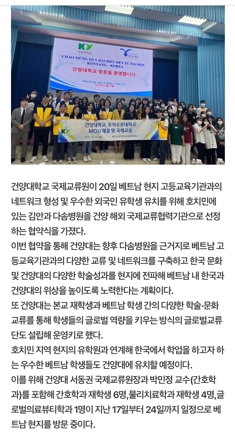 『 베트남 호치민_건양대학교 국제교류원장(물리치료학과 서동권 교수)와 물리치료학과 재학생 4명 참여 』글의 상세내용을 확인하는 표로 제목, 부서명, 등록일, 조회, 첨부, 내용으로 나뉘어 설명합니다.