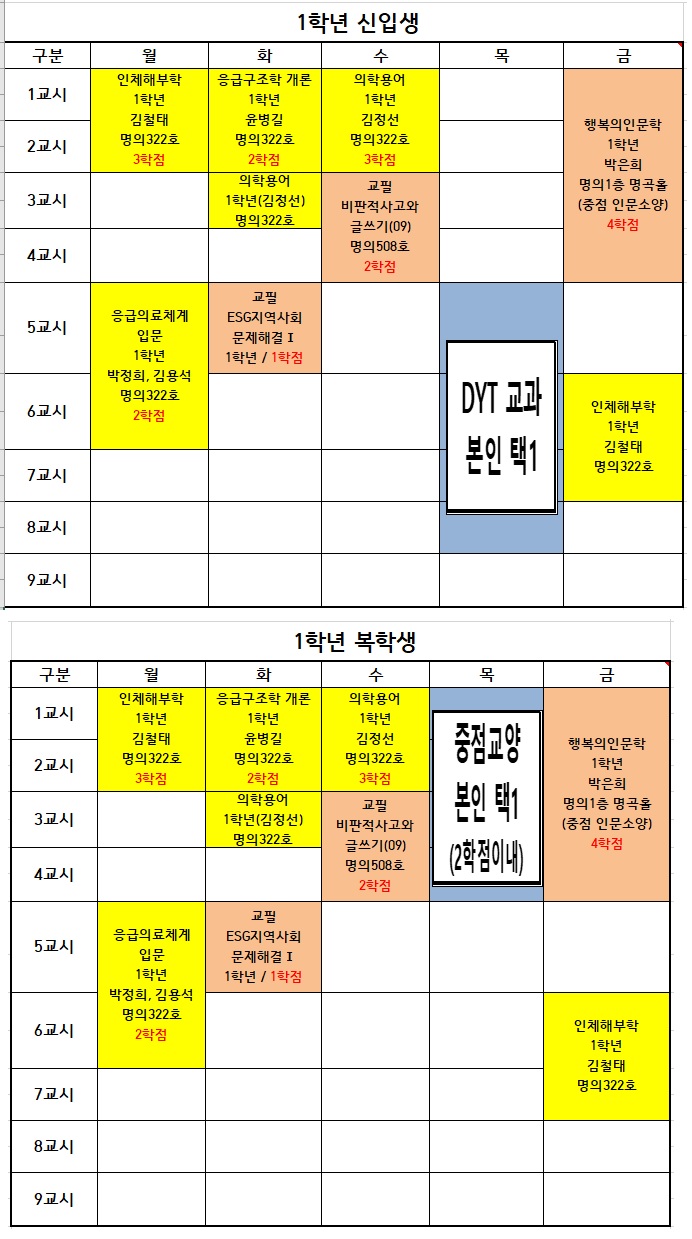 - 2.22(수) 교양수강신청은 하지 않습니다.(금요일 1~4교시 선 반영됨) - 2.24(금) DYT 만 수강신청 합니다.(과목은 아래와 같습니다)