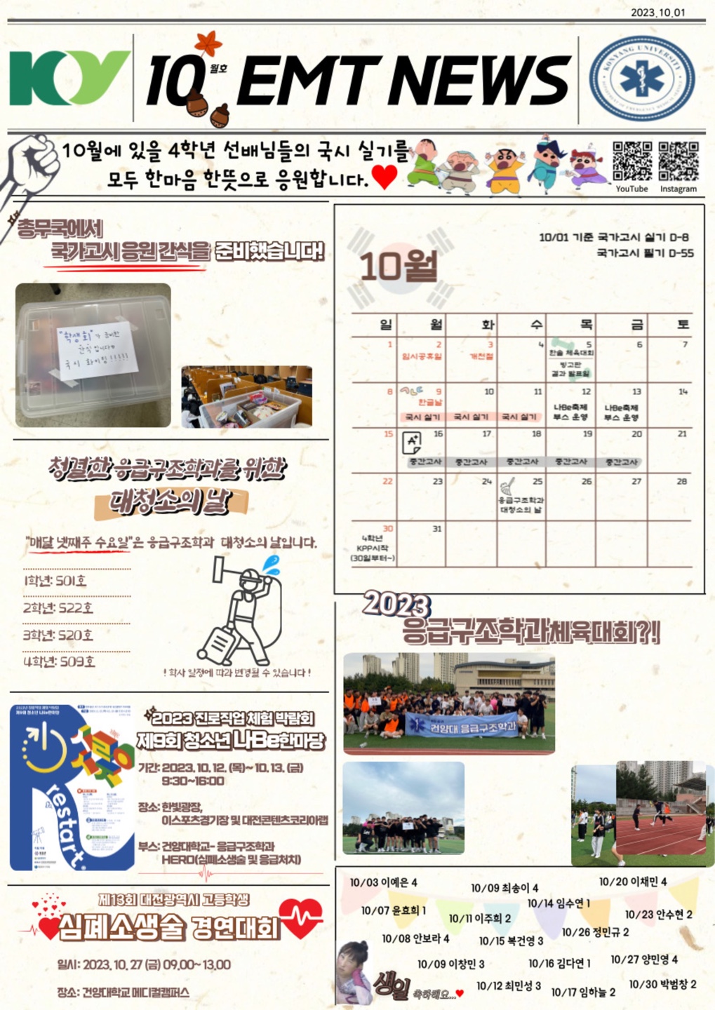 『 2023년도 10월 EMT NEWS 』글의 상세내용을 확인하는 표로 제목, 부서명, 등록일, 조회, 첨부, 내용으로 나뉘어 설명합니다.