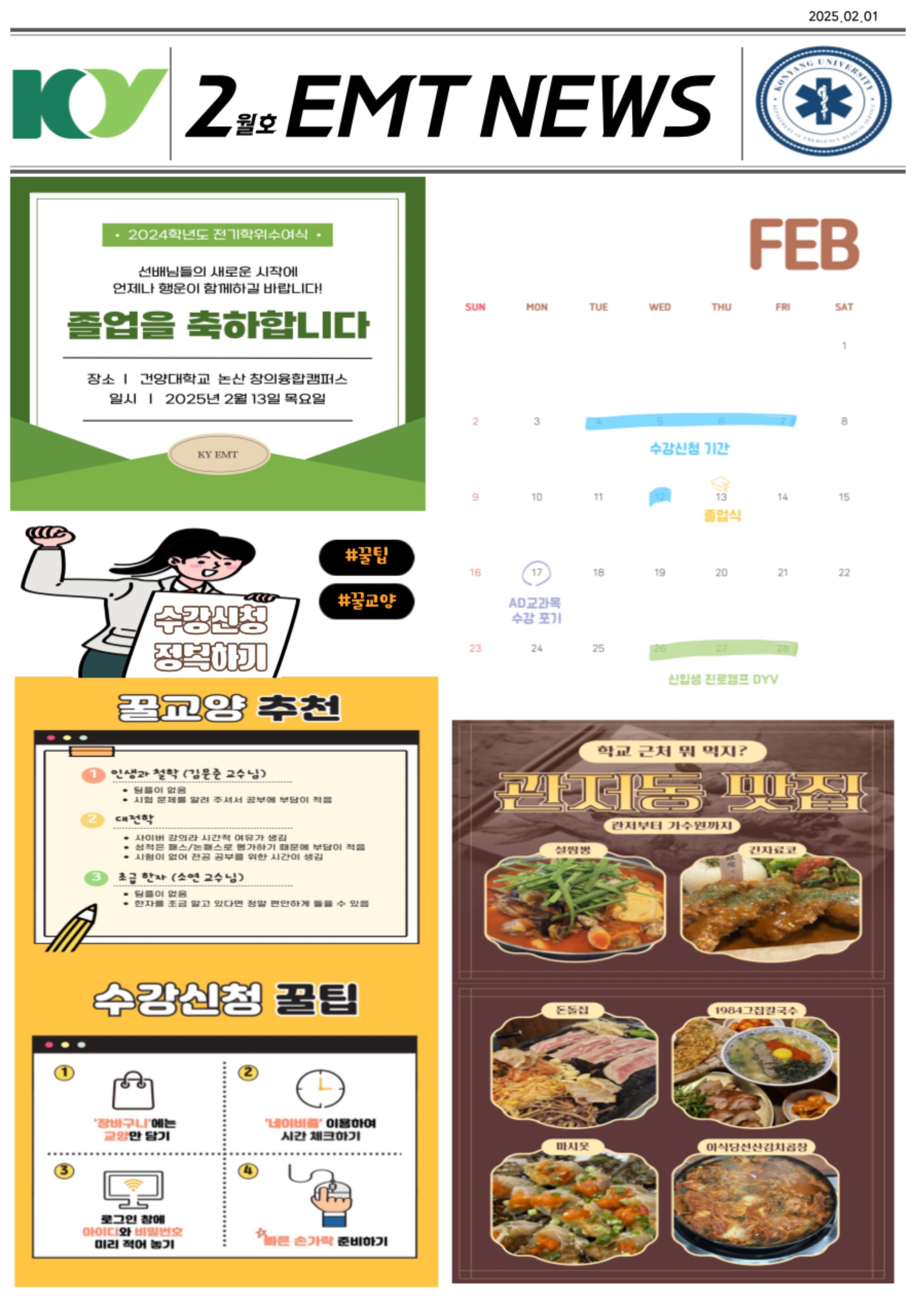 『 2025년도 02월 EMT NEWS 』글의 상세내용을 확인하는 표로 제목, 부서명, 등록일, 조회, 첨부, 내용으로 나뉘어 설명합니다.