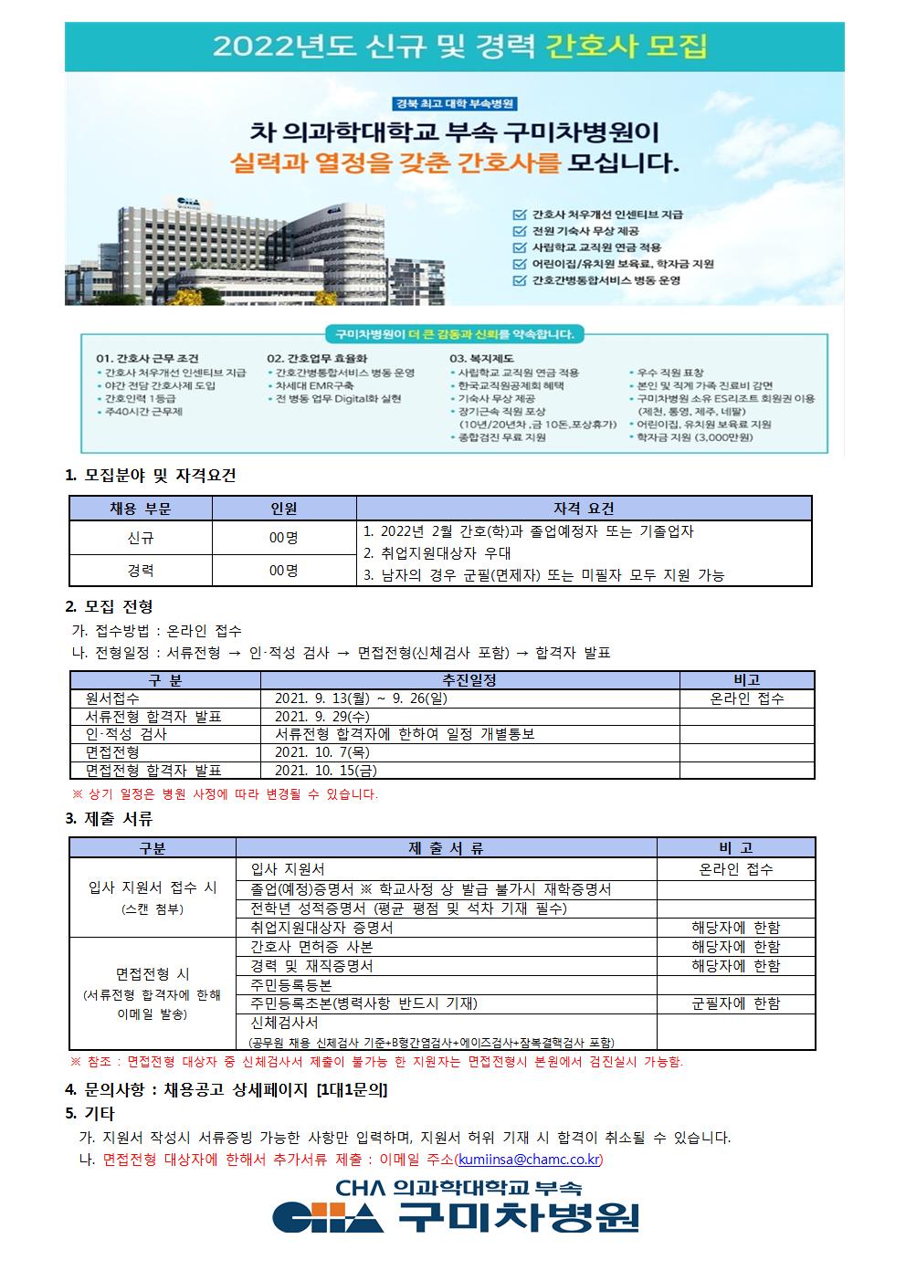 『 [채용공고] 2022년도 차 의과학대학교 부속 구미차병원 졸업예정자 간호사 모집 』글의 상세내용을 확인하는 표로 제목, 부서명, 등록일, 조회, 첨부, 내용으로 나뉘어 설명합니다.