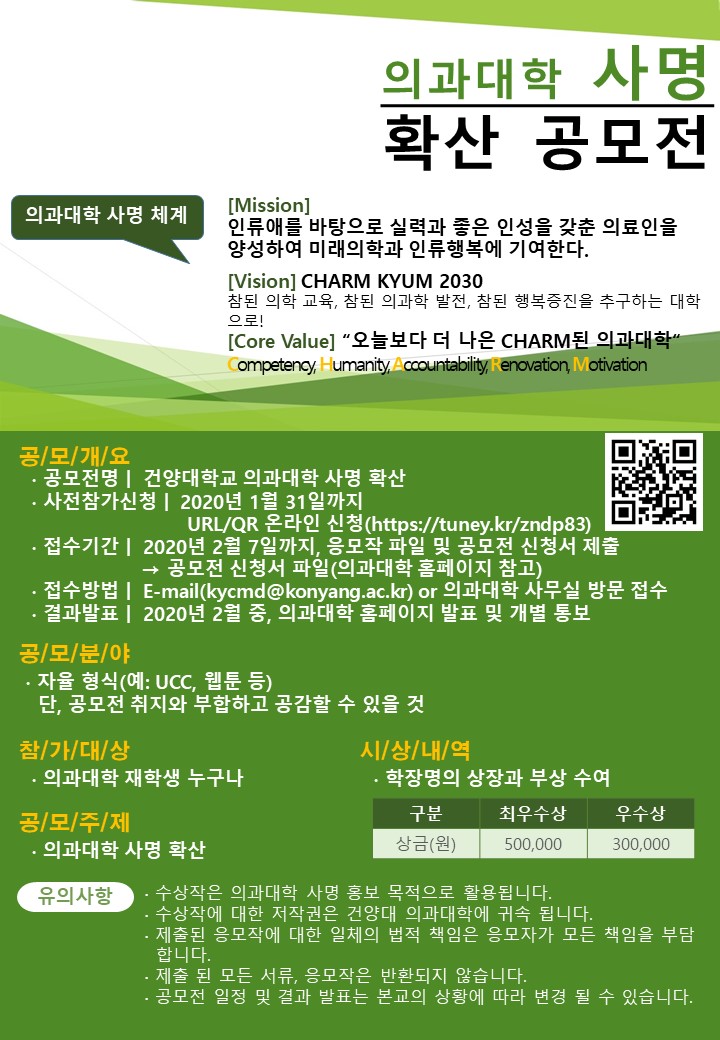 | 제목 | [공모] 의과대학 사명 확산 공모전 안내 | ||||
