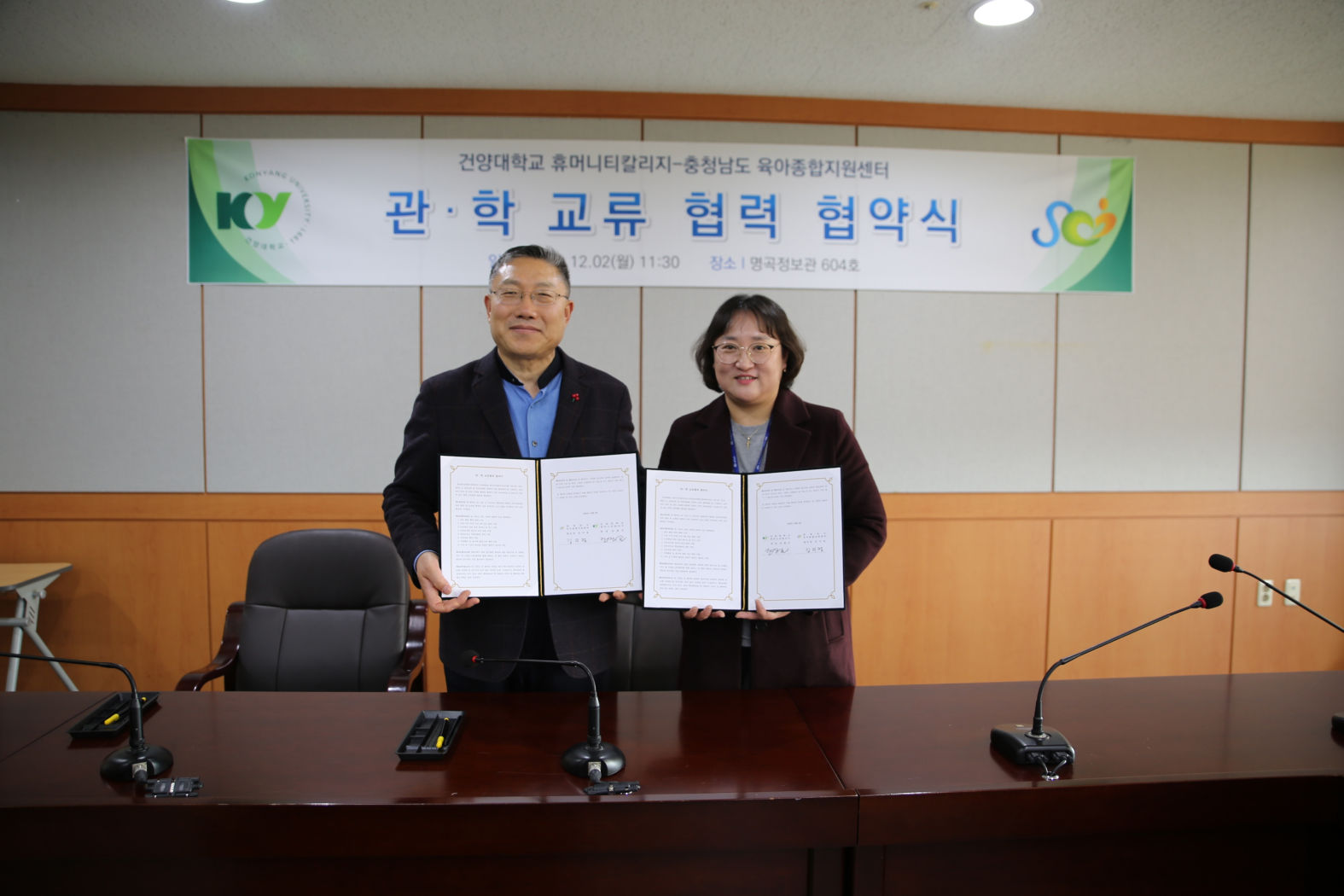 건양대 휴머니티칼리지-충남 육아종합지원센터 상호교류 및 유대강화를 위한 MOU체결 건양대학교(총장 이원묵) 휴머니티칼리지(학장 김형곤)가 지난 2일 논산 창의융합캠퍼스에서 충청남도 육아종합지원센터(센터장 김미정)와 상호교류 및 유대강화를 위한 업무협약을 체결했다. 대학과 육아교육 현장과의 협력 및 교류를 통해 상호 연계 프로그램을 추진하기 위해 진행된 이번 행사를 통해 양 기관은 2년 간 △정보 활용 협력 체계 구축 △각종 지역 연계 프로그램 상호 협력지원 △교육현장 관련 공동세미나 및 연구 지원 △보육교직원 전문성 증진 관련 지원 △영유아부모 역량강화에 관한 지원 △교육실습 협력사항 △자원활동 및 봉사에 관한 상호 협력 지원 등 8가지 사항에 대해 상호 협력 운영하기로 합의했다. 김형곤 휴머니티칼리지학장은 “양 기관 간 교류협력 체계를 구축하고 교육정보 공유와 같이 긴밀한 협력을 통해 지역 교육 발전에 이바지 할 수 있도록 노력할 것”이라고 밝혔다.