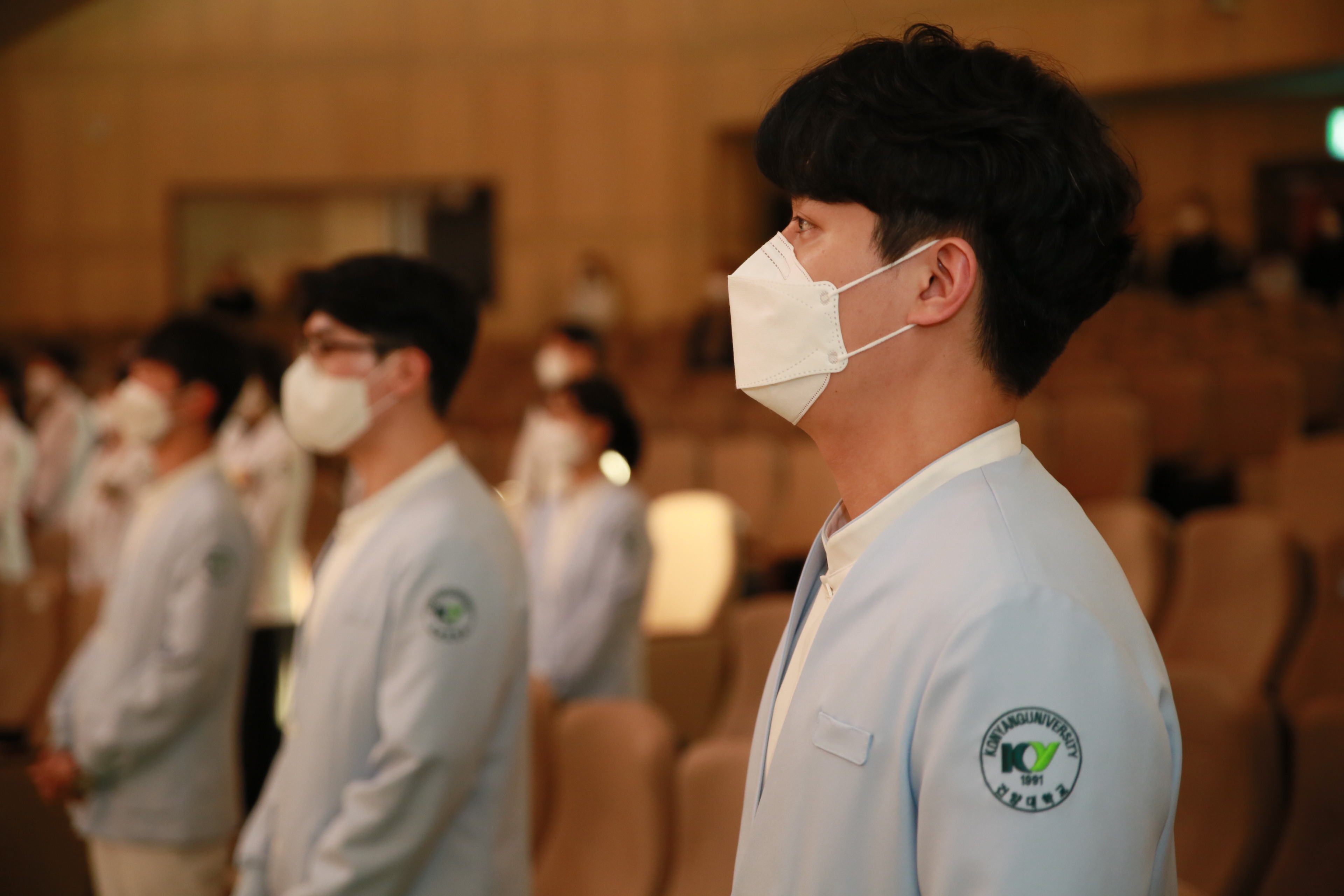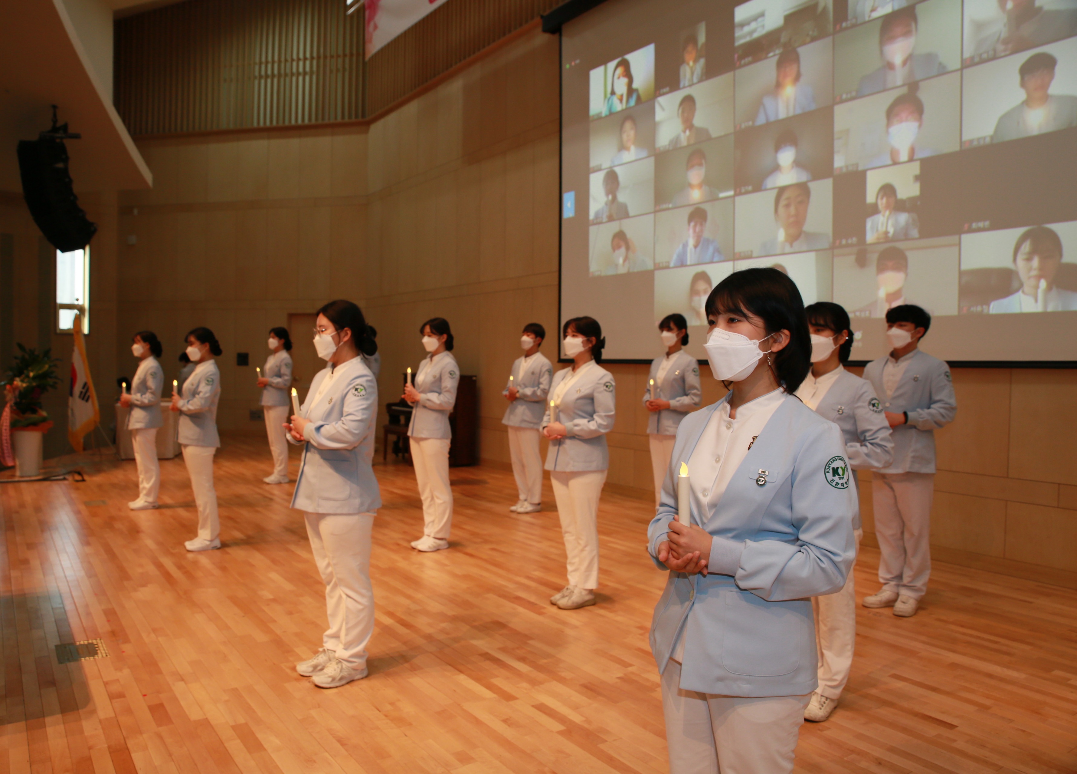 지난해까지는 간호대학 예비 졸업생 전원이 참석했으나 올해는 코로나19로 인해 현장에는 20명의 학생만 배석하고 나머지 148명의 학생들은 각자 자택에서 동영상 앱인 줌을 통해 온라인으로 참여했다.