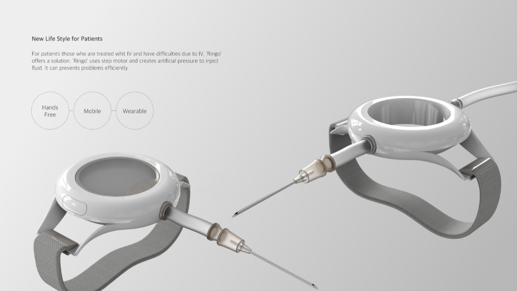 이번 iF디자인어워드에서 본상을 수상한 ‘링고(Ringo)’는 입원환자들이 흔히 겪는 링거대와 링거호스의 불편함을 개선한 웨어러블 수액 카트리지 디자인으로 건양대 융합디자인학과 정진수(‘21년 졸업) 씨와 손중규(’21년 졸업) 씨, 송재승 교수가 함께 출품했다. 병원 입원 환자들이 보통 움직일 때마다 끌고 다녀야하는 링거대는 거동의 어려움은 물론 식사 및 환복 등에 있어서도 상당한 불편함을 초래하는 것이 사실.