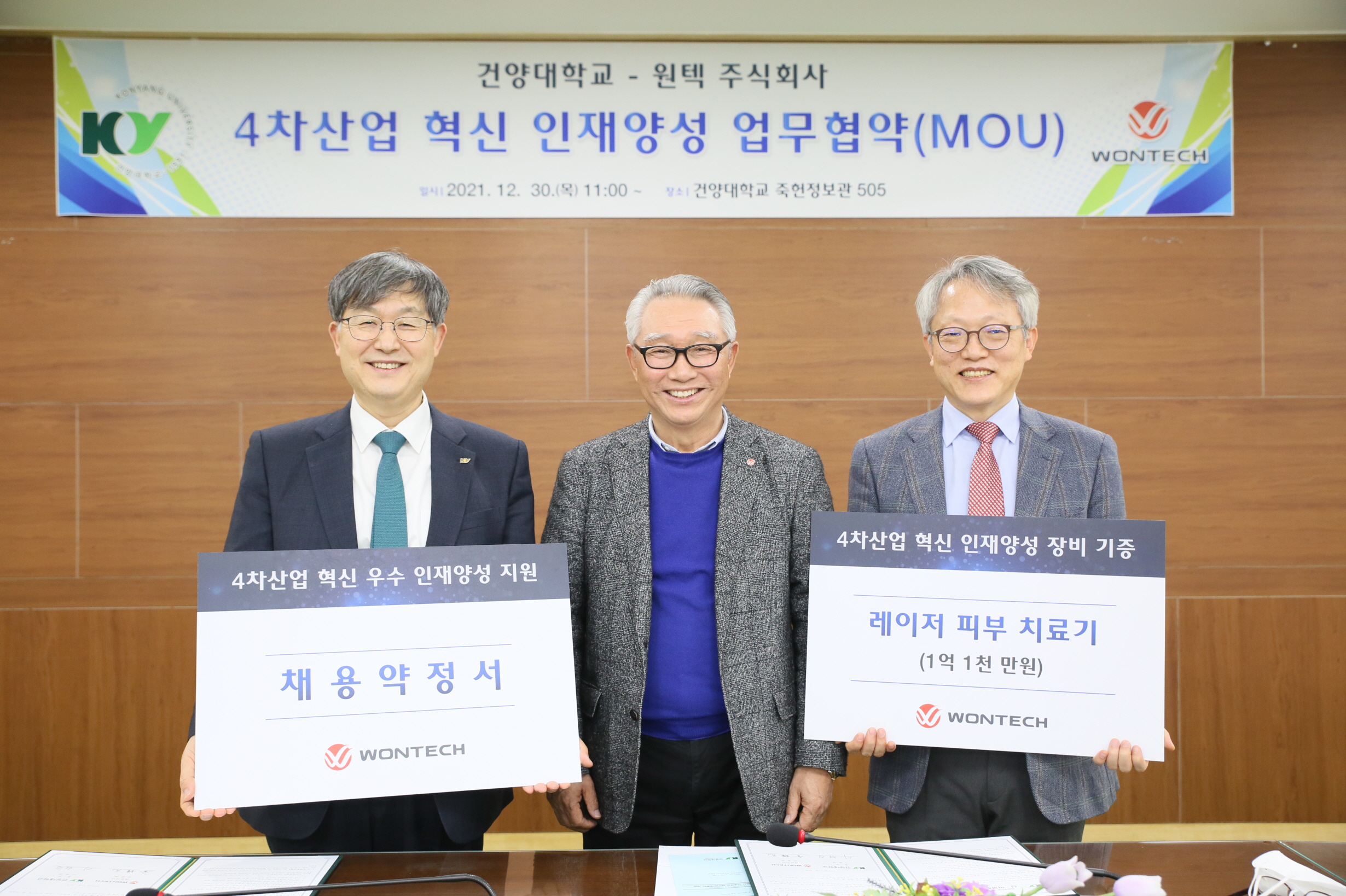 건양대-원텍㈜, 인재양성 위한 취업약정 및 기자재 기탁 업무협약 체결 “가르쳤으면 책임진다”는 교육철학에 ESG를 도입해 책임가치와 교육가치 실현에 앞장서고 있는 건양대학교(총장 이철성)가 30일 오전 메디컬캠퍼스에서 원텍 주식회사(대표 김종원)와 상호발전과 더불어 우수인재양성지원 및 공동관심분야 연구 협력체계 구축을 목적으로 산학 업무협약을 체결했다고 밝혔다. 1999년 설립된 원텍㈜은 피부⸱미용 분야의 글로벌 의료기기 전문기업으로 회사 자체적으로 제품의 연구, 개발, 생산과 더불어 A/S까지 모든 과정을 책임지고 있다. 이날 업무협약식에는 건양대 이철성 총장과 오도창 산학협력부총장, 홍영기 산학협력단장과 원텍㈜ 김종원 대표이사, 서영석 부원장, 복민규 부장 등이 참석했다. 건양대와 원텍㈜은 이날 업무협약 체결에 따라 향후 현장실무능력향상을 위한 인턴쉽 및 취업약정, 우수인력 양성을 위한 기자재 기증, 양 기관 보유장비 활용, 의료기기 개발 및 임상 분야 공동연구 등을 주요 골자로 협력하기로 했다. 뿐만 아니라 건양대학교 ICC(기업협업센터 : Industry Cooperation Center)에 속해 있는 의료기기 중개임상시험센터의 지원과 메디바이오 신뢰성센터의 의료기기 표준 규격 관련 교육과 관련하여 협력하는 방안도 지속적으로 도출할 계획이다. 원텍㈜은 이날 협약식에서 건양대 의료보건계열 학과 학생들의 실습을 위해 지난 7월 출시한 1억1천만원 상당의 첨단 피부레이저 치료기 Picocare Majesty를 건양대에 기증하겠다고 밝히기도 했다. 협약식을 주관한 건양대학교 이철성 총장은 “원텍(주)와 같은 의료기기 개발 및 임상 분야의 전문기업과의 업무협약이 우리 건양대 학생들의 현장경험 확대와 의료기기 기업지원 고도화에 크게 기여할 것으로 기대한다”고 밝혔다. 원텍㈜ 김종원 대표는 “이번 협약을 통해 건양대학교가 의료기기 분야의 우수인재를 양성하고 의료기기 기업지원에 선도적인 역할을 할 수 있도록 적극적으로 협조할 것”이라고 밝히는 한편 “건양대와의 공동연구 및 제품개발을 통해 더 좋은 성과를 만들어낼 것으로 확신한다”고 말했다. 사진 1. 왼쪽부터 원텍㈜ 서영석 연구부원장, 건양대 홍영기 산학협력단장, 건양대 이철성 총장, 원텍㈜ 김종원 대표이사, 건양대 오도창 산학협력부총장, 원텍㈜ 복민규 부장, 원텍㈜ 이재성 과장 순 사진 2. 왼쪽부터 이철성 건양대총장, 김종원 원텍㈜ 대표이사, 오도창 건양대 산학협력부총장 순
