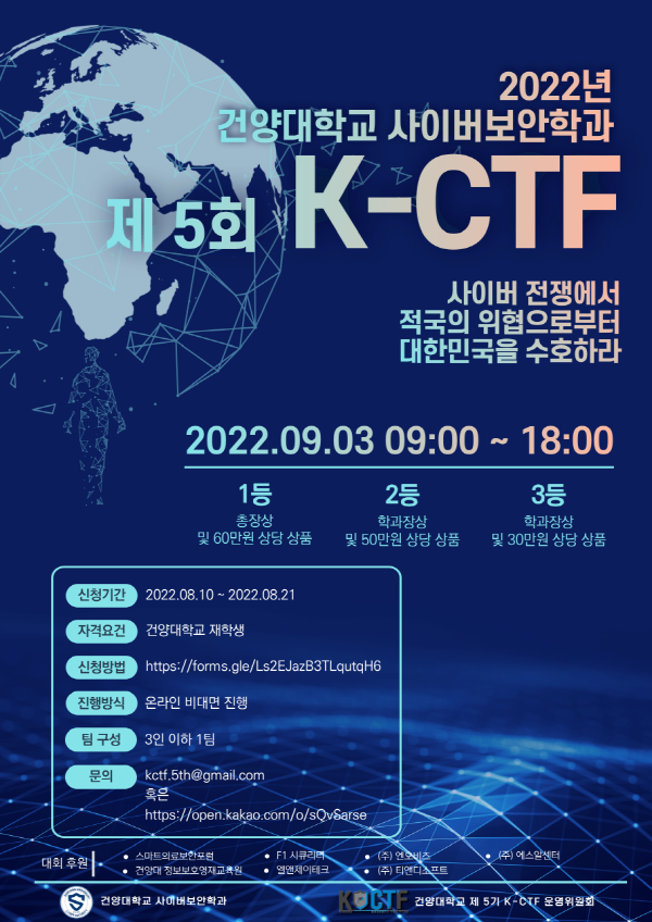건양대학교(총장 김용하) 사이버보안학과가 ‘제5회 해킹방어대회(K-CTF)’를 다음달 9월 3일 비대면(온라인)으로 개최한다고 밝혔다.