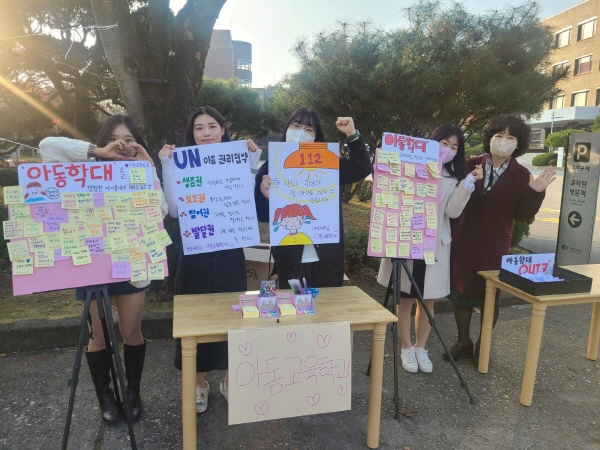 이날 아동교육학과 학생회 임원과 소속 교수들은 교내 구성원을 대상으로 아동학대 행동 여부에 대한 퀴즈 이벤트를 진행하여 학대 아동을 위한 사회적 관심과 예방책이 무엇인지 함께 고민해 보는 공감의 기회를 제공했다.