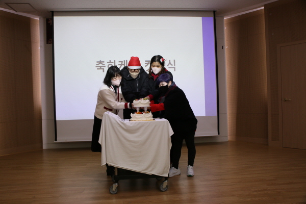27일 오후 열린 논산발그래일터 1주년 행사에서 1주년을 기념하는 케이크 커팅을 하는 논산발그래일터 청년직원 및 부모의 모습.jpg