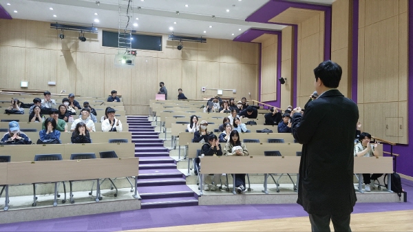건양대 디지털콘텐츠학과 졸업생 정상훈 씨가 후배들을 위한 취업특강을 진행하는 모습 1.jpg