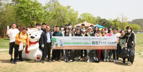 건양대학교(총장 김용하) 초등특수교육과 학생들과 논산발그래일터(장애인보호작업장)에서 근무하는 장애인 청년들이 장애인의 날(4.20)을 앞두고 함께 줍킹(워킹을 하면서 쓰레기를 줍는 활동)을 진행해 눈길을 끌고 있다.