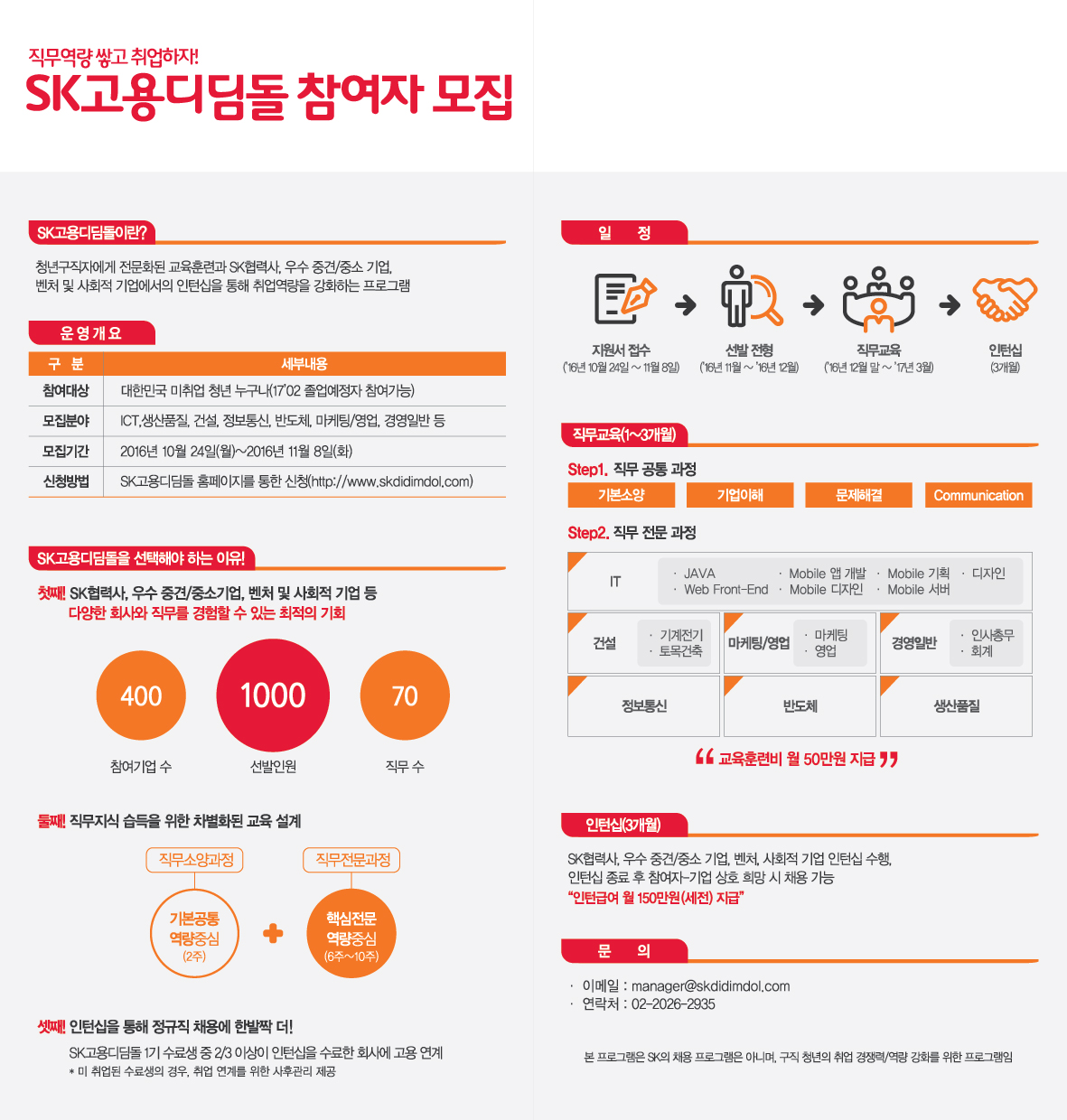 취업을 희망하는 구직청년에게 SK만의 전문화된 직무교육과 SK협력사를 포함한 우수 중소·중견기업에서의 인턴십 제공을 통해 청년의 취업경쟁력을 제고하고 실제 취업으로 연계되도록 지원하는 "SK고용디딤돌"이 3기 참여자를 모집하고 있으니, 재학생 여러분의 많은 관심 바랍니다.