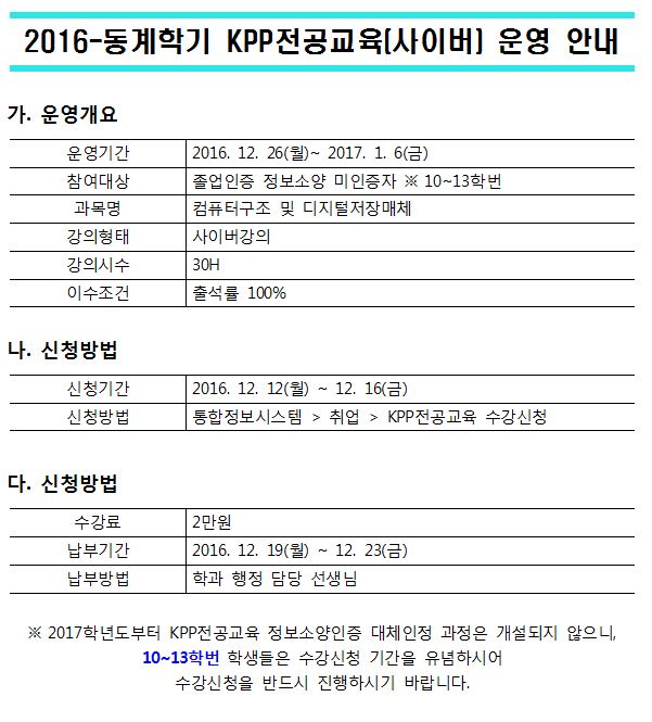 | 제목 | 2016-동계학기 KPP전공교육(사이버) 운영 안내 | ||||