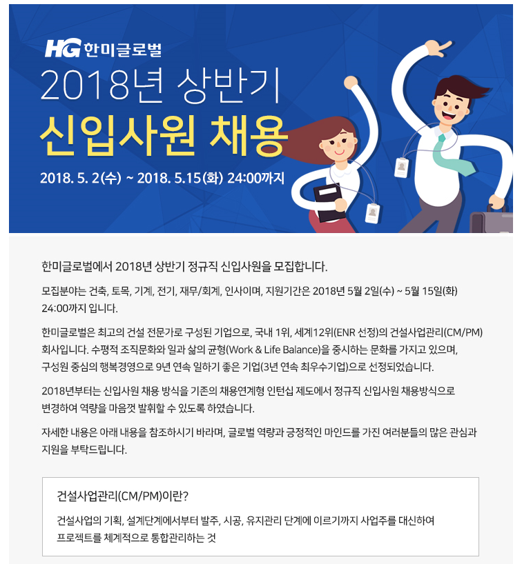 | 제목 | 한미글로벌 2018년 상반기 정규직 신입사원 채용 | ||||